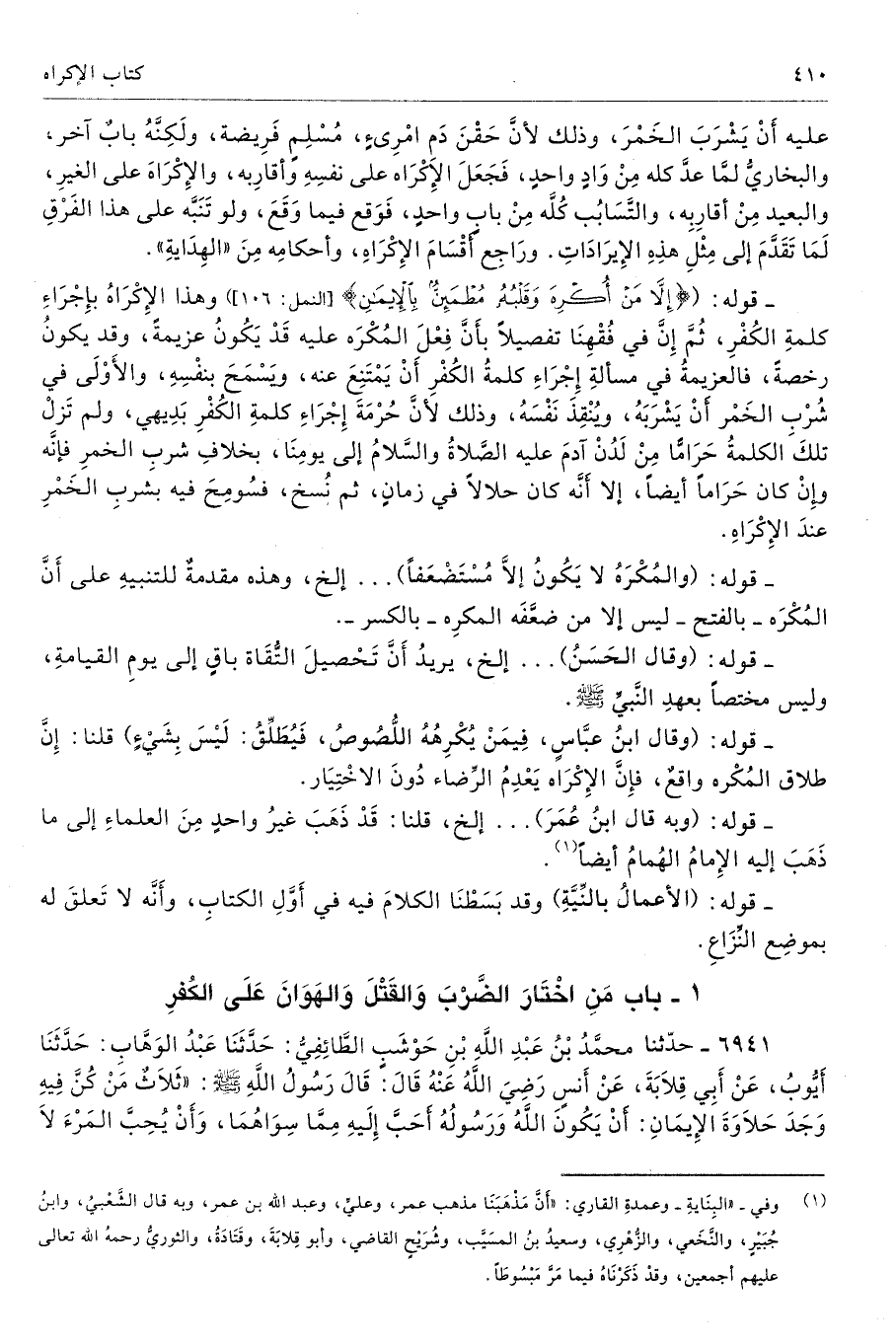 عليه أَنْ يَشْرَبَ الخَمْرَ، وذلك لأنَّ حَقْنَ دَمِ امْرِىءٍ، مُسْلِمٍ فَرِيضة، ولَكِنَّهُ بابٌ آخر، والبخاريُّ لمَّا عدَّ كله مِنْ وَادٍ واحدٍ، فَجَعَلَ الإِكْرَاه على نفسِهِ وأقارِبه، والإِكْرَاهَ على الغيرِ، والبعيدِ مِنْ أقارِبِه، والتَّسَابُبِ كُلَّه مِنْ بابٍ واحدٍ، فَوَقع فيما وَقَعَ، ولو تَنَبَه على هذا الفَرْقِ لَمَا تَقَدَّمَ إلى مِثْلِ هذِهِ الإِيرَادَاتِ. ورَاجِع أَقْسَامَ الإِكْرَاهِ، وأحكامِه مِنَ «الهِدَايةِ».