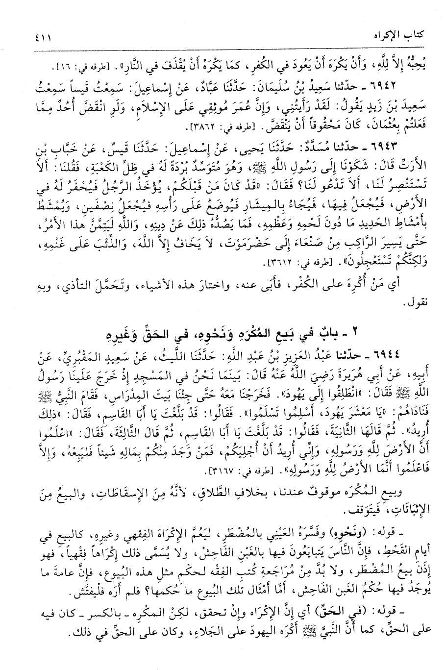 - قوله: (ونَحْوِهِ) وفَسَّرَهُ العَيْنِي بالمُضْطَرِ، ليَعُمَّ الإِكْرَاهَ الفِقَهي وغيرِهِ، كالبيعِ في أيامِ القَحْطِ، فإِنَّ النَّاسَ يَعبايَعُونَ فيها بالغَبْنِ الفَاحِشْ، ولا يُسَمَّى ذلك إِكْرَاهًا فِقْهيًا، فهو إِذَن بيعُ المُضْطَر، ولا بُدَّ مِنْ مُرَاجَعةِ كُتْبِ الفِقْه لحكْمِ مثلِ هذه البُيوع، فإِنَّ عامةَ ما يُوجَدُ فيها حُكْمُ الغَبن الفَاحِشْ، أَمَّا أَمْثَال تلك البُيوع ما حُكْكُها؟ فلم أَرَه فلْيفتَّش.