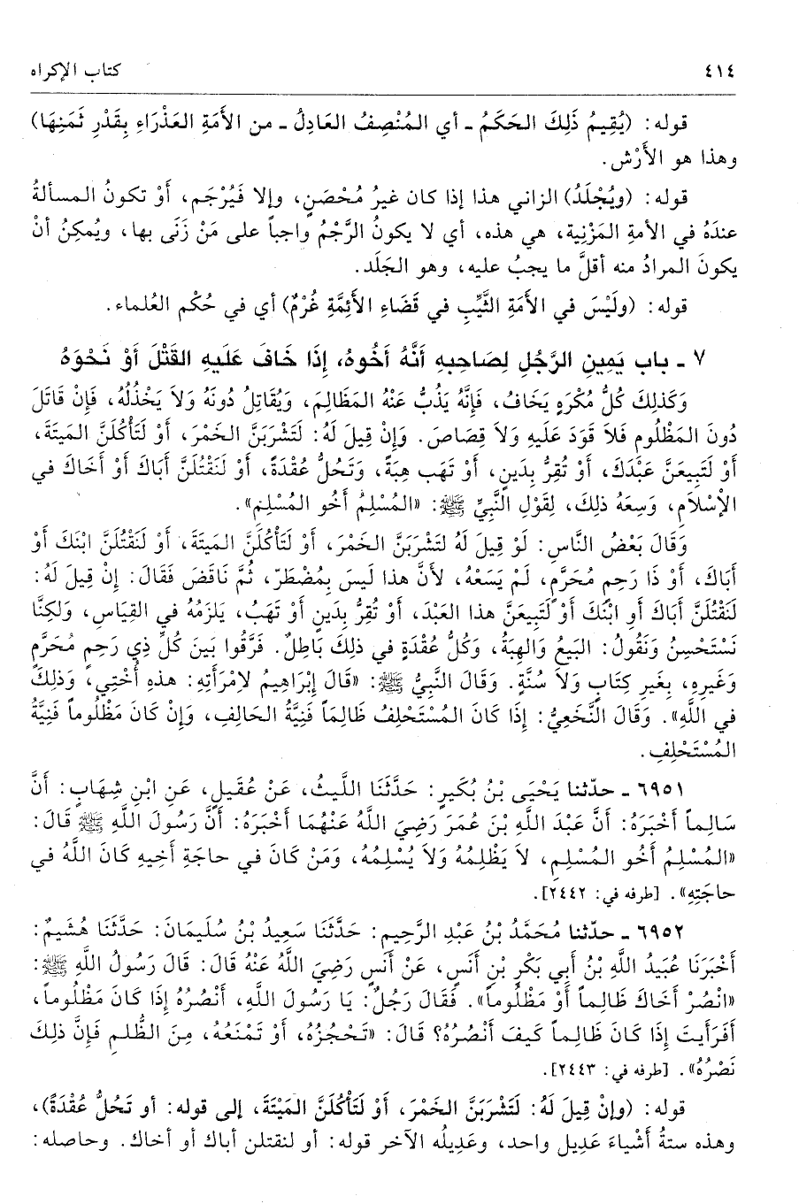 وَكَذلِكَ كُلُّ مُكْرَهٍ يَخَافُ، فَإِنَّهُ يَذُبُّ عَنْهُ المَظَالِمَ، وَيُقَاتِلُ دُونَهُ وَلاَ يَخْذُلُهُ، فَإِنْ قَاتَلَ دُونَ المُظْلُومِ فَلاَ قَوَدَ عَلَيهِ وَلاَ قِصَاصَ. وَإِنْ قِيلَ لَهُ: لَتَشْرَبَنَّ الخَمْرَ، أَوْ لَتَأْكُلَنَّ المَيتَةَ، أَوْ لَتَبِيعَنَّ عَبْدَكَ، أَوْ تُقِرُّ بِدَينٍ، أَوْ تَهَب هِبَةً، وَتَحُلُّ عُقْدَةً، أَوْ لَنَقْتُلَنَّ أَبَاكَ أَوْ أَخَاكَ في الإِسْلاَمِ، وَسِعَهُ ذلِكَ، لِقَوْلِ النبي صلى الله عليه وسلّم «المُسْلِمُ أَخُو المُسْلِمِ».