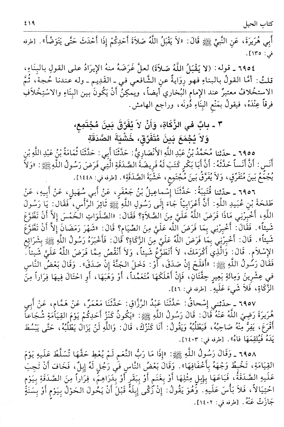 6958 - وَقَالَ رَسُولُ اللَّهِ - صلى الله عليه وسلم - «إِذَا مَا رَبُّ النَّعَمِ لَمْ يُعْطِ حَقَّهَا، تُسَلَّطُ عَلَيْهِ يَوْمَ الْقِيَامَةِ، تَخْبِطُ وَجْهَهُ بِأَخْفَافِهَا». وَقَالَ بَعْضُ النَّاسِ فِى رَجُلٍ لَهُ إِبِلٌ، فَخَافَ أَنْ تَجِبَ عَلَيْهِ الصَّدَقَةُ، فَبَاعَهَا بِإِبِلٍ مِثْلِهَا، أَوْ بِغَنَمٍ، أَوْ بِبَقَرٍ، أَوْ بِدَرَاهِمَ، فِرَارًا مِنَ الصَّدَقَةِ بِيَوْمٍ، احْتِيَالاً فَلاَ بَأْسَ عَلَيْهِ، وَهْوَ يَقُولُ إِنْ زَكَّى إِبِلَهُ قَبْلَ أَنْ يَحُولَ الْحَوْلُ بِيَوْمٍ أَوْ بِسَنَةٍ، جَازَتْ عَنْهُ. أطرافه 1402، 2378، 3073 - تحفة 14734