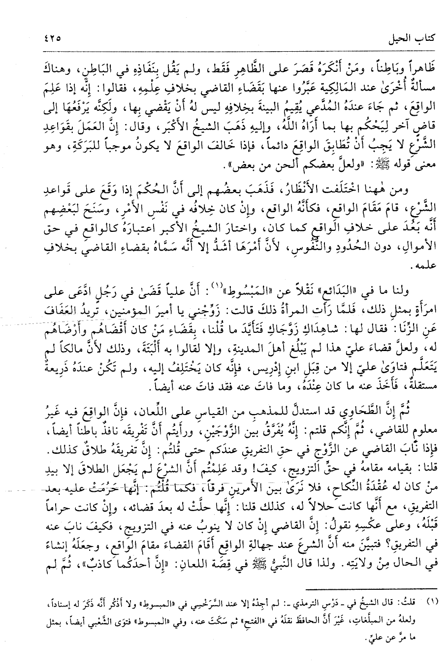 ثُمَّ إِنَّ الطَّحَاوِي قد استدلَّ للمذهبِ من القياسِ على اللِّعان، فإِنَّ الواقِعَ فيه غَيرُ معلومٍ للقاضي، ثُمَّ إِنَّكم قلتم: إِنَّهُ يُفَرَّقُ بين الزَّوْجَيْنِ، ورأَيتُم أَنَّ تَفْرِيقَه نافذٌ باطنًا أيضًا، فإِذا نَابَ القاضي عن الزَّوْجِ في حقِ التفريقِ عندَكم حتى قُلتُم: إِنَّ تفريقَهُ طلاقٌ كذلك. قلنا: بقيامه مقامهُ في حقِّ التزويجِ، كيفَ وقد عَلِمْتُم أَنَّ الشرْعَ لم يَجْعَل الطلاقَ إلا بيدِ منْ كان له عُقْدَةُ النِّكاحِ، فلا نَرَى بين الأَمرينِ فرقًا، فكما قُلْتُم: إنَّها حَرُمَتْ عليه بعد التفريقِ، مع أَنَّها كانت حلالًا له، كذلك قلنا: إِنَّها حلَّتْ له بعدَ قضائه، وإِنْ كانت حرامًا قَبْلَهُ، وعلى عكْسِهِ نقولُ: إِنَّ القاضي إِنْ كان لا ينوبُ عنه في التزويجِ، فكيفَ نابَ عنه في التفريقِ؟ فتبيَّنَ منه أَنَّ الشرعَ عند جهالةِ الواقِعِ أَقَامَ القضاءَ مقامَ الواقعِ، وجعَلَهُ إنشاءً في الحال مِنْ ولايَتِه. ولذا قال النَّبيُّ صلى الله عليه وسلّم في قِصَة اللعانِ: «إِنَّ أحدَكُما كاذبٌ»، ثُمَّ لم