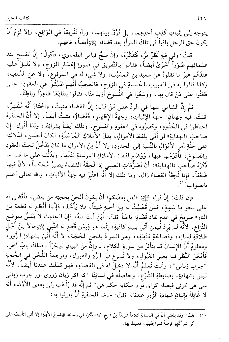 فإن قلتَ: إِنَّ قوله صلى الله عليه وسلّم «لعل بعضَكم» أَنْ يكونَ ألحنَ بحجتِه من بعض، فأَقْضِي له على نحو ما سَمِعَ، فمن قَضَيْتُ له مِن أخيهِ شيئًا، فلا يَأْخُذ، فإِنَّما أَقْطَع له قطعة من النار» صريحٌ في عدمِ نفاذِ قَضَائِه باطنًا قلتُ: أَيْنَ أنتَ منهُ، فإِن الحديثَ لا يَمَسُ بموضعِ النِّزاعِ، لأنَّه لم يَرِدْ فيمن أَتَى ببينةٍ كاذبةٍ، إِنَّما هو فِيمَن قَطَعَ له النَّبي صلى الله عليه وسلّم مالًا مِنْ أَجْلِ طلاقةِ لسانِه، وفصاحَةِ مَنْطِقِه، وهو المرادُ بلحن الحُجَّة، لا أَنَّه أَتَى بشهادةِ الزُّور، ومعلومٌ أَنَّ الإِنسانَ قد يتأثرُ من سورةِ الكلامِ، - وإِنَّ منَ البيانِ لسِحْرًا - فذلكَ بابٌ آخر، فَأَمْعَنَ النَّظر فيه بعينِ القَبُولِ، ولا تُسرع في الرَّدِ والقبولِ، وترجمةُ اللَّحْنِ في الحُجةِ جرب زبانى، وأنت تَعلمُ أَنَّه لا دخلَ له في القضاءِ، فهو كذلك عندنا أيضًا، لأَنَّه ليس بشهادةٍ، بضابطةِ الشَّرْعِ. وحاصلُه في لسانِنَا كه اكر زبان زورى اور جرب زبانى سى هى كوئى فيصله كراى تواو سكايه حكم هى ثم إِنَّه قد يَذْهَب إلى بعض الأَوْهَامِ أَنَّه لا غَائِلةَ بإِتيانِ شهادةِ الزُّورِ عندنا، قلتُ: حاشا للحنفيةِ أَنْ يقولوا به: