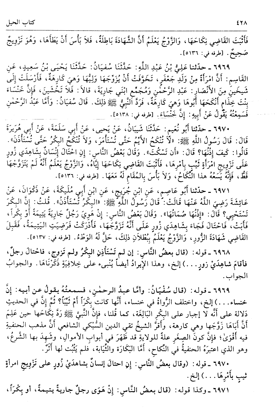 6969 - قوله: (قال سُفْيَانُ: وأمَّا عبدُ الرحمنِ، فسمعتُهُ يقولُ عن أبيه: إِنَّ خنساء ... ) إلخ، واختلف الرُّواةُ في خنساء، أَنَّها كانت بِكْرًا أَمْ ثَيِّبًا؟ ثُمَّ إِنَّ في الحديثِ دَلالة على أَنَّه لا إجبار على البِكْرِ البَالِغَة، كما قُلنا، فإِنَّ النَّبيَّ صلى الله عليه وسلّم رَدَّ نِكَاحَها حين عَلِمَ أَنَّ أَبَاهَا زَوَّجَها وهي كارهة، وأَقرَّ الشيخُ تقي الدين السُّبْكي الشافعي أَنَّ مذهب الحنفيةِ فيه أَقْوَى؛ فإِنَّ كونَ الصِغَرِ علةً للولايةِ قد ظَهَرَ في أبوابِ الأموالِ، وشَهِدَ بها الشَّرعُ، وهو الذي اعتبرَهُ الحنفيةُ في النِّكاحِ، أَمَّا البَكَارَة والثِّيَابة، فلم يَثْبُت لها أَثَرٌ.
