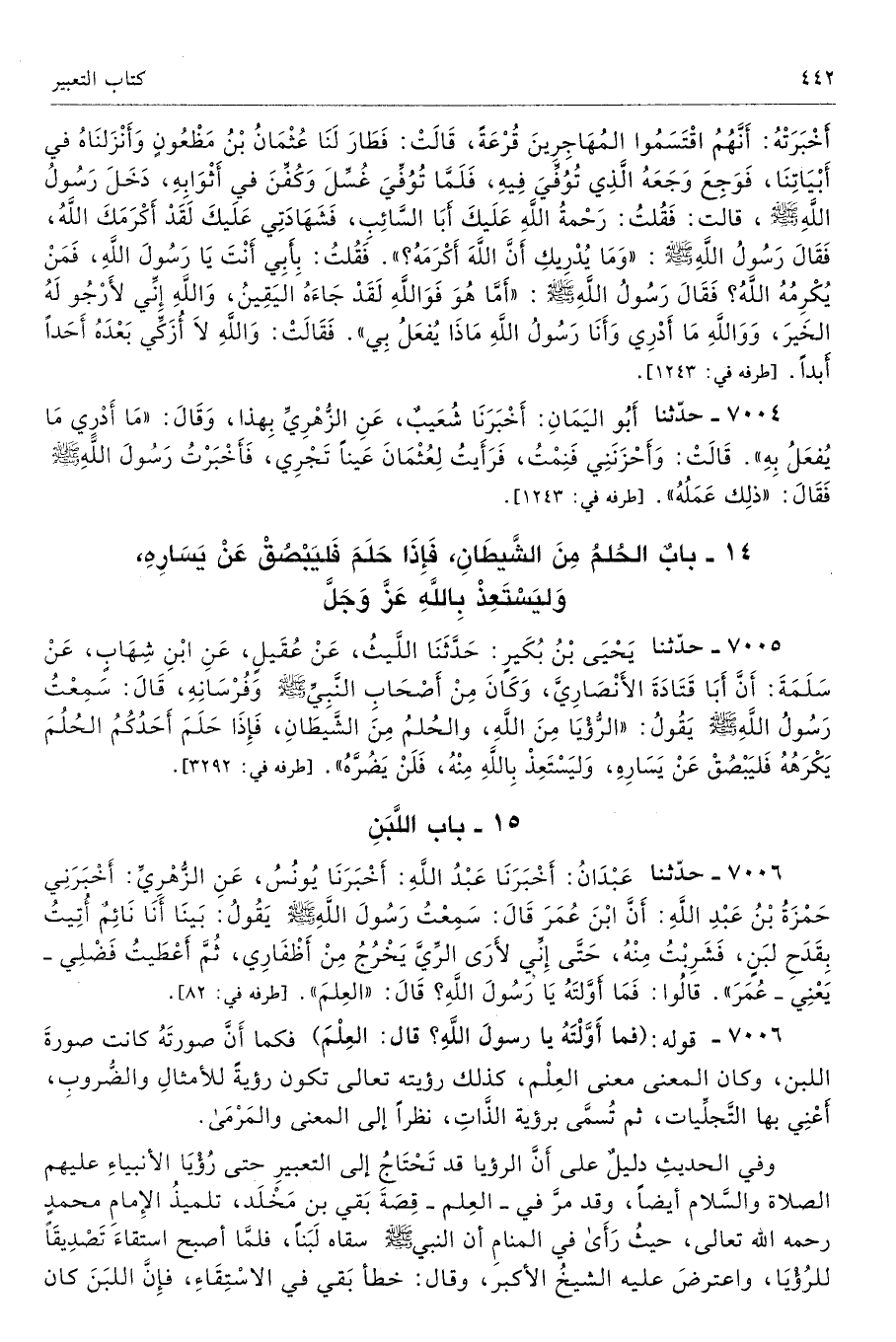 7006 - حَدَّثَنَا عَبْدَانُ أَخْبَرَنَا عَبْدُ اللَّهِ أَخْبَرَنَا يُونُسُ عَنِ الزُّهْرِىِّ أَخْبَرَنِى حَمْزَةُ بْنُ عَبْدِ اللَّهِ أَنَّ ابْنَ عُمَرَ قَالَ سَمِعْتُ رَسُولَ اللَّهِ - صلى الله عليه وسلم - يَقُولُ «بَيْنَا أَنَا نَائِمٌ أُتِيتُ بِقَدَحِ لَبَنٍ، فَشَرِبْتُ مِنْهُ، حَتَّى إِنِّى لأَرَى الرِّىَّ يَخْرُجُ مِنْ أَظْفَارِى، ثُمَّ أَعْطَيْتُ فَضْلِى». يَعْنِى عُمَرَ. قَالُوا فَمَا أَوَّلْتَهُ يَا رَسُولَ اللَّهِ قَالَ «الْعِلْمَ». أطرافه 82، 3681، 7007، 7027، 7032 - تحفة 6700