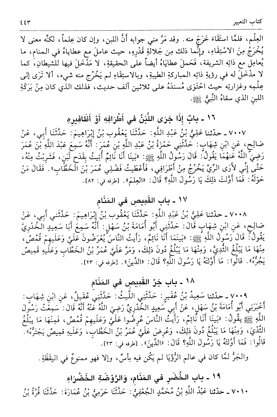 7009 - حَدَّثَنَا سَعِيدُ بْنُ عُفَيْرٍ حَدَّثَنِى اللَّيْثُ حَدَّثَنِى عُقَيْلٌ عَنِ ابْنِ شِهَابٍ أَخْبَرَنِى أَبُو أُمَامَةَ بْنُ سَهْلٍ عَنْ أَبِى سَعِيدٍ الْخُدْرِىِّ - رضى الله عنه - قَالَ سَمِعْتُ رَسُولَ اللَّهِ - صلى الله عليه وسلم - يَقُولُ «بَيْنَا أَنَا نَائِمٌ رَأَيْتُ النَّاسَ عُرِضُوا عَلَىَّ، وَعَلَيْهِمْ قُمُصٌ، فَمِنْهَا مَا يَبْلُغُ الثَّدْىَ، وَمِنْهَا مَا يَبْلُغُ دُونَ ذَلِكَ، وَعُرِضَ عَلَىَّ عُمَرُ بْنُ الْخَطَّابِ وَعَلَيْهِ قَمِيصٌ يَجْتَرُّهُ». قَالُوا فَمَا أَوَّلْتَهُ يَا رَسُولَ اللَّهِ قَالَ «الدِّينَ». أطرافه 23، 3691، 7008 - تحفة 3961 - 46/ 9
