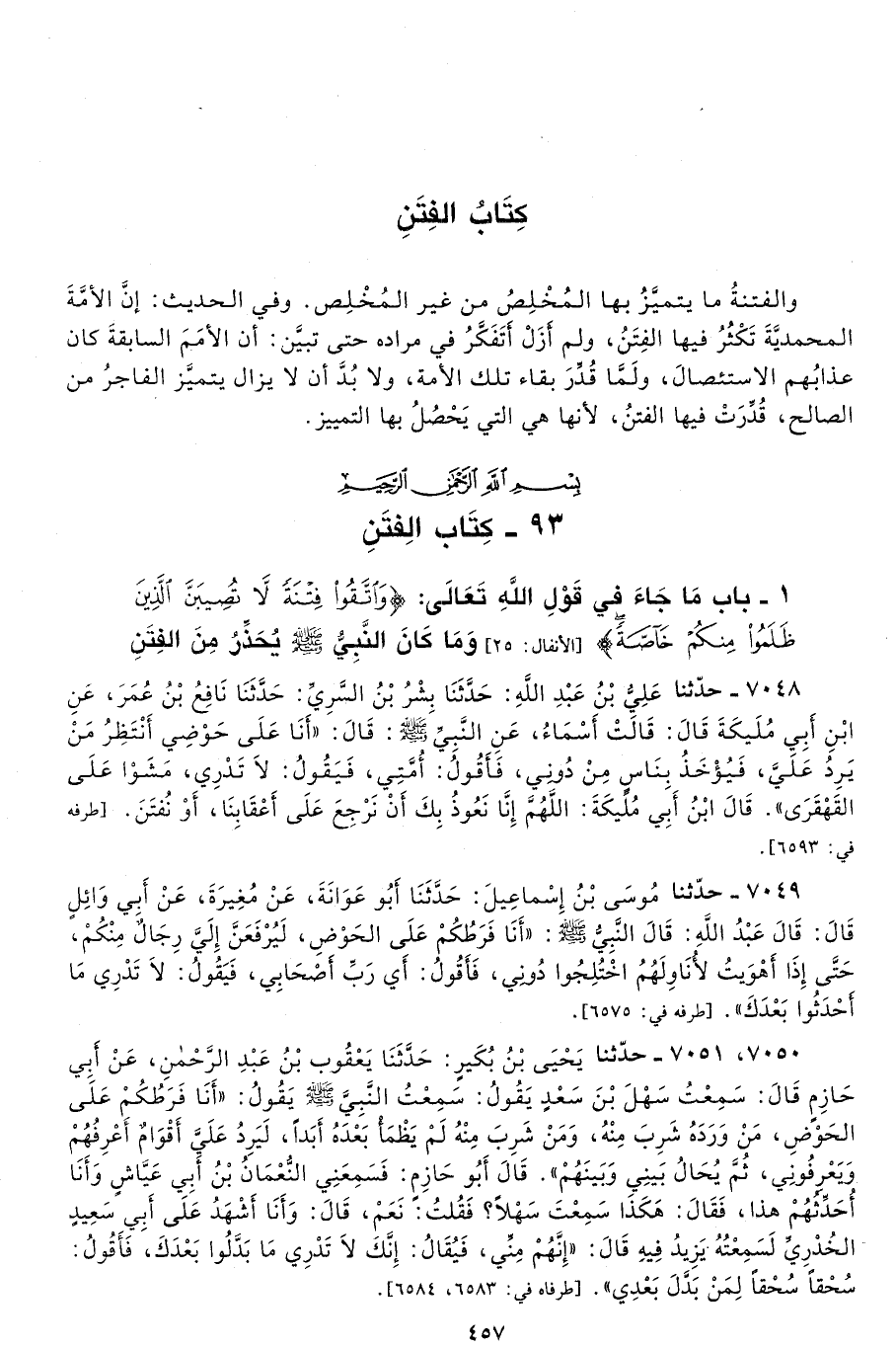 7049 - حَدَّثَنَا مُوسَى بْنُ إِسْمَاعِيلَ حَدَّثَنَا أَبُو عَوَانَةَ عَنْ مُغِيرَةَ عَنْ أَبِى وَائِلٍ قَالَ قَالَ عَبْدُ اللَّهِ قَالَ النَّبِىُّ - صلى الله عليه وسلم - «أَنَا فَرَطُكُمْ عَلَى الْحَوْضِ، لَيُرْفَعَنَّ إِلَىَّ رِجَالٌ مِنْكُمْ حَتَّى إِذَا أَهْوَيْتُ لأُنَاوِلَهُمُ اخْتُلِجُوا دُونِى فَأَقُولُ أَىْ رَبِّ أَصْحَابِى. يَقُولُ لاَ تَدْرِى مَا أَحْدَثُوا بَعْدَكَ». طرفاه 6575، 6576 - تحفة 9292
