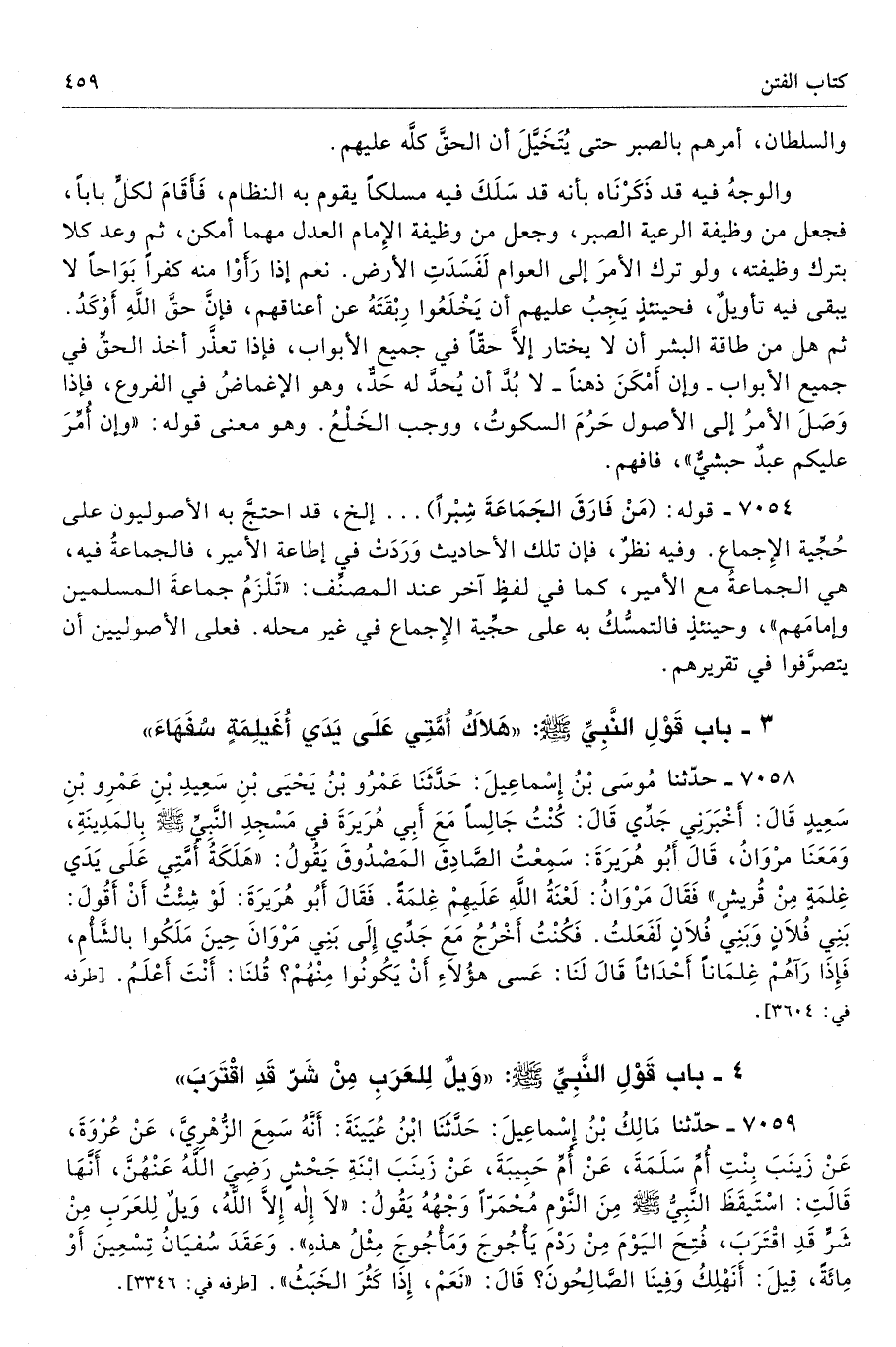 7054 - قوله: (مَنْ فَارَقَ الجَمَاعَةَ شِبْرًا) ... إلخ، قد احتجَّ به الأصوليون على حُجِّية الإِجماع. وفيه نظرٌ، فإن تلك الأحاديث وَرَدَتْ في إطاعة الأمير، فالجماعةُ فيه، هي الجماعةُ مع الأمير، كما في لفظٍ آخر عند المصنِّف: «تَلْزَمُ جماعةَ المسلمين وإمامَهم»، وحينئذٍ فالتمسُّكُ به على حُجِّية الإِجماع في غير محله. فعلى الأصوليين أن يتصرَّفوا في تقريرهم.