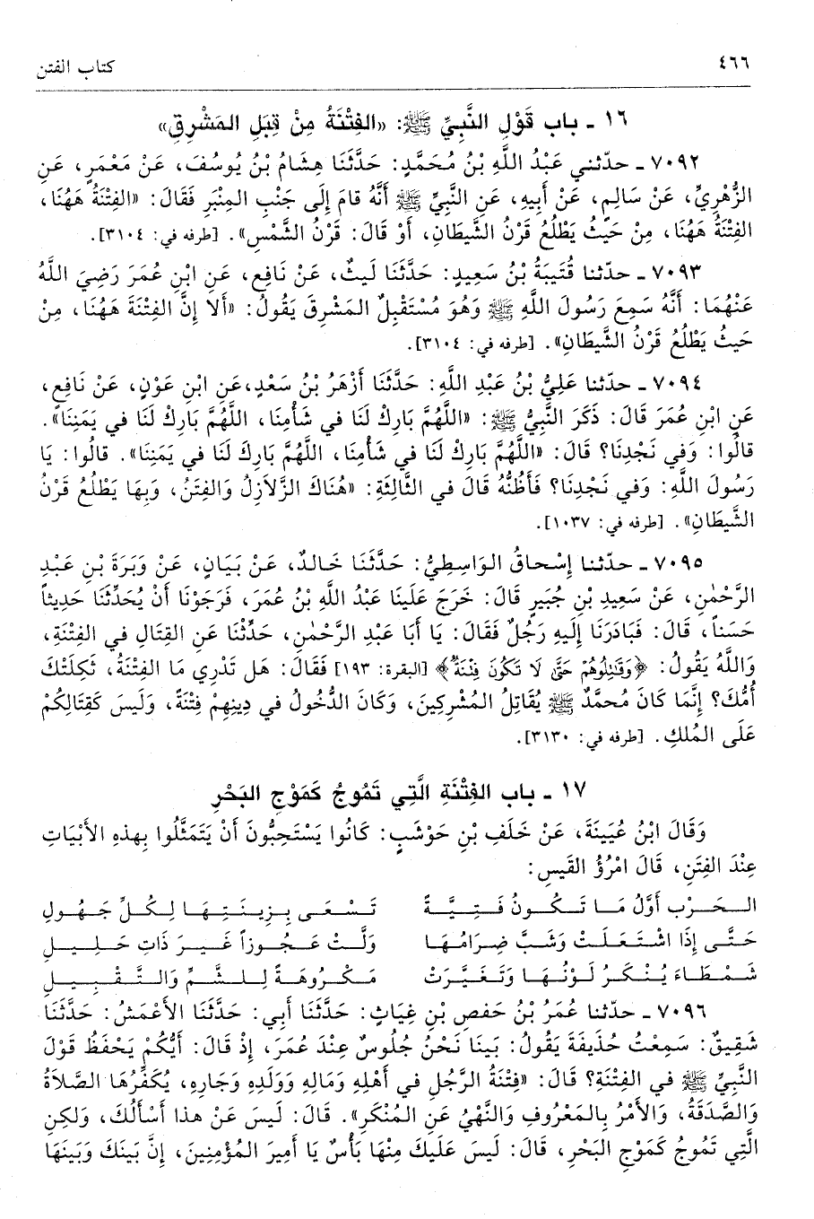 7092 - حَدَّثَنِى عَبْدُ اللَّهِ بْنُ مُحَمَّدٍ حَدَّثَنَا هِشَامُ بْنُ يُوسُفَ عَنْ مَعْمَرٍ عَنِ الزُّهْرِىِّ عَنْ سَالِمٍ عَنْ أَبِيهِ عَنِ النَّبِىِّ - صلى الله عليه وسلم - أَنَّهُ قَامَ إِلَى جَنْبِ الْمِنْبَرِ فَقَالَ «الْفِتْنَةُ هَا هُنَا الْفِتْنَةُ هَا هُنَا مِنْ حَيْثُ يَطْلُعُ قَرْنُ الشَّيْطَانِ». أَوْ قَالَ «قَرْنُ الشَّمْسِ». أطرافه 3104، 3279، 3511، 5296، 7093 - تحفة 6939