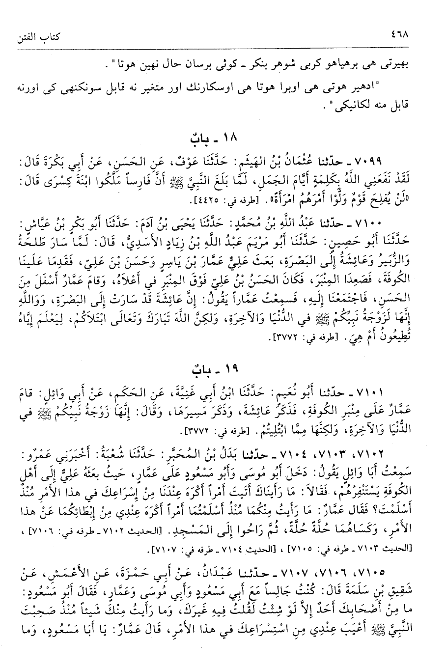 7099 - حَدَّثَنَا عُثْمَانُ بْنُ الْهَيْثَمِ حَدَّثَنَا عَوْفٌ عَنِ الْحَسَنِ عَنْ أَبِى بَكْرَةَ قَالَ لَقَدْ نَفَعَنِى اللَّهُ بِكَلِمَةٍ أَيَّامَ الْجَمَلِ لَمَّا بَلَغَ النَّبِىَّ - صلى الله عليه وسلم - أَنَّ فَارِسًا مَلَّكُوا ابْنَةَ كِسْرَى قَالَ «لَنْ يُفْلِحَ قَوْمٌ وَلَّوْا أَمْرَهُمُ امْرَأَةً». طرفه 4425 - تحفة 11660