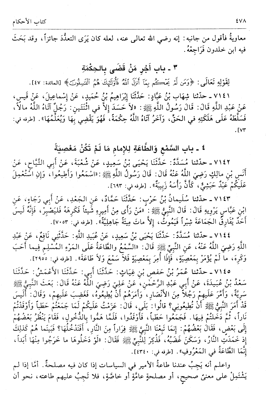7144 - حَدَّثَنَا مُسَدَّدٌ حَدَّثَنَا يَحْيَى بْنُ سَعِيدٍ عَنْ عُبَيْدِ اللَّهِ حَدَّثَنِى نَافِعٌ عَنْ عَبْدِ اللَّهِ - رضى الله عنه - عَنِ النَّبِىِّ - صلى الله عليه وسلم - قَالَ «السَّمْعُ وَالطَّاعَةُ عَلَى الْمَرْءِ الْمُسْلِمِ، فِيمَا أَحَبَّ وَكَرِهَ، مَا لَمْ يُؤْمَرْ بِمَعْصِيَةٍ، فَإِذَا أُمِرَ بِمَعْصِيَةٍ فَلاَ سَمْعَ وَلاَ طَاعَةَ». طرفه 2955 - تحفة 8150