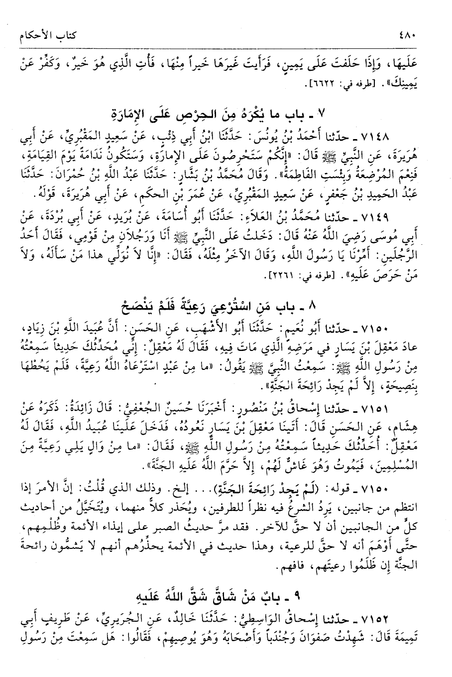 7149 - حَدَّثَنَا مُحَمَّدُ بْنُ الْعَلاَءِ حَدَّثَنَا أَبُو أُسَامَةَ عَنْ بُرَيْدٍ عَنْ أَبِى بُرْدَةَ عَنْ أَبِى مُوسَى - رضى الله عنه - قَالَ دَخَلْتُ عَلَى النَّبِىِّ - صلى الله عليه وسلم - أَنَا وَرَجُلاَنِ مِنْ قَوْمِى فَقَالَ أَحَدُ الرَّجُلَيْنِ أَمِّرْنَا يَا رَسُولَ اللَّهِ. وَقَالَ الآخَرُ مِثْلَهُ. فَقَالَ «إِنَّا لاَ نُوَلِّى هَذَا مَنْ سَأَلَهُ، وَلاَ مَنْ حَرَصَ عَلَيْهِ». أطرافه 2261، 3038، 4341، 4344، 6124، 6923، 7156، 7157، 7172 تحفة 9054