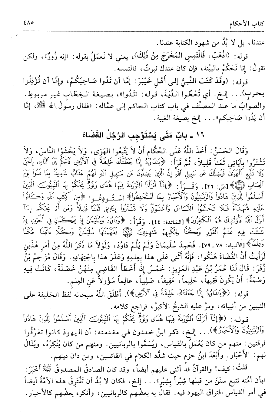 وَقَالَ الحَسَنُ: أَخَذَ اللهُ عَلَى الحُكَّامِ أَنْ لاَ يَتَّبِعُوا الهَوَى، وَلاَ يَخْشَوُا النَّاسَ، وَلاَ تَشْتَرُوا بِآيَاتِي ثَمَنًا قَلِيلًا، ثُمَّ قَرَأَ: {يَا دَاوُودُ إِنَّا جَعَلْنَاكَ خَلِيفَةً فِي الْأَرْضِ فَاحْكُمْ بَيْنَ النَّاسِ بِالْحَقِّ وَلَا تَتَّبِعِ الْهَوَى فَيُضِلَّكَ عَنْ سَبِيلِ اللَّهِ إِنَّ الَّذِينَ يَضِلُّونَ عَنْ سَبِيلِ اللَّهِ لَهُمْ عَذَابٌ شَدِيدٌ بِمَا نَسُوا يَوْمَ الْحِسَابِ (26)} [ص: 26]. وَقَرَأَ: {إِنَّا أَنْزَلْنَا التَّوْرَاةَ فِيهَا هُدًى وَنُورٌ يَحْكُمُ بِهَا النَّبِيُّونَ الَّذِينَ أَسْلَمُوا لِلَّذِينَ هَادُوا وَالرَّبَّانِيُّونَ وَالْأَحْبَارُ بِمَا اسْتُحْفِظُوا} اسْتُودِعُوا {مِنْ كِتَابِ اللَّهِ وَكَانُوا عَلَيْهِ شُهَدَاءَ فَلَا تَخْشَوُا النَّاسَ وَاخْشَوْنِ وَلَا تَشْتَرُوا بِآيَاتِي ثَمَنًا قَلِيلًا وَمَنْ لَمْ يَحْكُمْ بِمَا أَنْزَلَ اللَّهُ فَأُولَئِكَ هُمُ الْكَافِرُونَ} [المائدة: 44]. وَقَرَأَ: {وَدَاوُودَ وَسُلَيْمَانَ إِذْ يَحْكُمَانِ فِي الْحَرْثِ إِذْ نَفَشَتْ فِيهِ غَنَمُ الْقَوْمِ وَكُنَّا لِحُكْمِهِمْ شَاهِدِينَ (78) فَفَهَّمْنَاهَا سُلَيْمَانَ وَكُلًّا آتَيْنَا حُكْمًا وَعِلْمًا} [الأنبياء: 78 - 79]. فَحَمِدَ سُلَيمَانَ وَلَمْ يَلُمْ دَاوُدَ، وَلَوْلاَ مَا ذَكَرَ اللهُ مِنْ أَمْرِ هذَيْنِ لَرَأَيتُ أَنَّ القُضَاةَ هَلَكُوا، فَإِنَّهُ أَثْنى عَلَى هذا بِعِلمِهِ وَعَذَرَ هذا بِاجْتِهَادِهِ. وَقَالَ مُزَاحِمُبْنُ زُفَرَ: قَالَ لَنَا عُمَرُبْنُ عَبْدِ العَزِيزِ: خَمْسٌ إِذَا أَخْطَأَ القَاضِي مِنْهُنَّ خَصْلَةً، كَانَتْ فِيهِ وَصْمَةٌ: أَنْ يَكُوْنَ فَقِيهًا، حَلِيمًا، عَفِيفًا، صَلِيبًا، عالِمًا سَؤُولًا عَنِ العِلمِ.