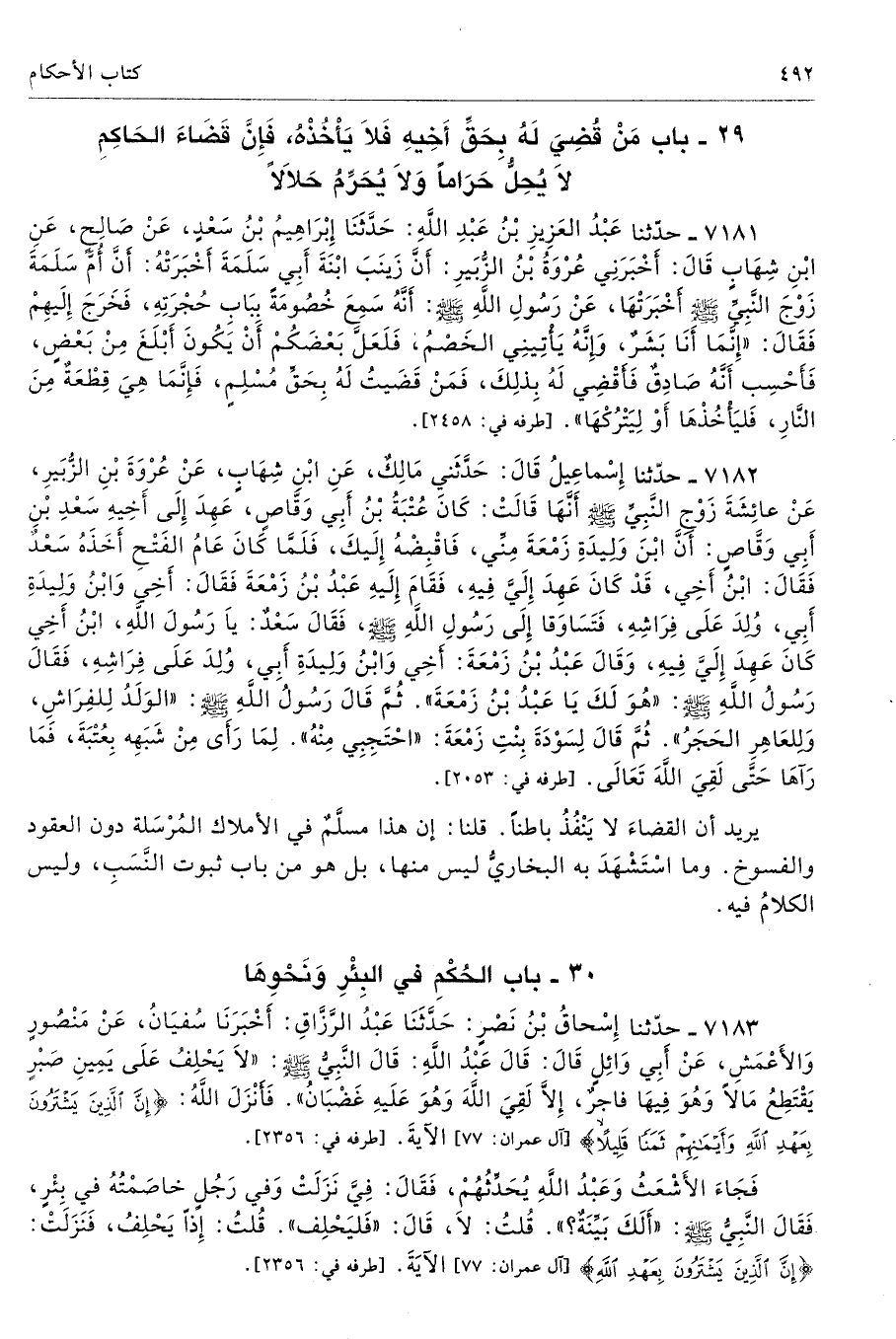 7181 - حَدَّثَنَا عَبْدُ الْعَزِيزِ بْنُ عَبْدِ اللَّهِ حَدَّثَنَا إِبْرَاهِيمُ بْنُ سَعْدٍ عَنْ صَالِحٍ عَنِ ابْنِ شِهَابٍ قَالَ أَخْبَرَنِى عُرْوَةُ بْنُ الزُّبَيْرِ أَنَّ زَيْنَبَ ابْنَةَ أَبِى سَلَمَةَ أَخْبَرَتْهُ أَنَّ أُمَّ سَلَمَةَ زَوْجَ النَّبِىِّ - صلى الله عليه وسلم - أَخْبَرَتْهَا عَنْ رَسُولِ اللَّهِ - صلى الله عليه وسلم - أَنَّهُ سَمِعَ خُصُومَةً بِبَابِ حُجْرَتِهِ فَخَرَجَ إِلَيْهِمْ فَقَالَ «إِنَّمَا أَنَا بَشَرٌ، وَإِنَّهُ يَأْتِينِى الْخَصْمُ، فَلَعَلَّ بَعْضَكُمْ أَنْ يَكُونَ أَبْلَغَ مِنْ بَعْضٍ، فَأَحْسِبُ أَنَّهُ صَادِقٌ فَأَقْضِى لَهُ بِذَلِكَ، فَمَنْ قَضَيْتُ لَهُ بِحَقِّ مُسْلِمٍ، فَإِنَّمَا هِىَ قِطْعَةٌ مِنَ النَّارِ، فَلْيَأْخُذْهَا أَوْ لِيَتْرُكْهَا». أطرافه 2458، 2680، 6967، 7169، 7185 - تحفة 18261 - 90/ 9