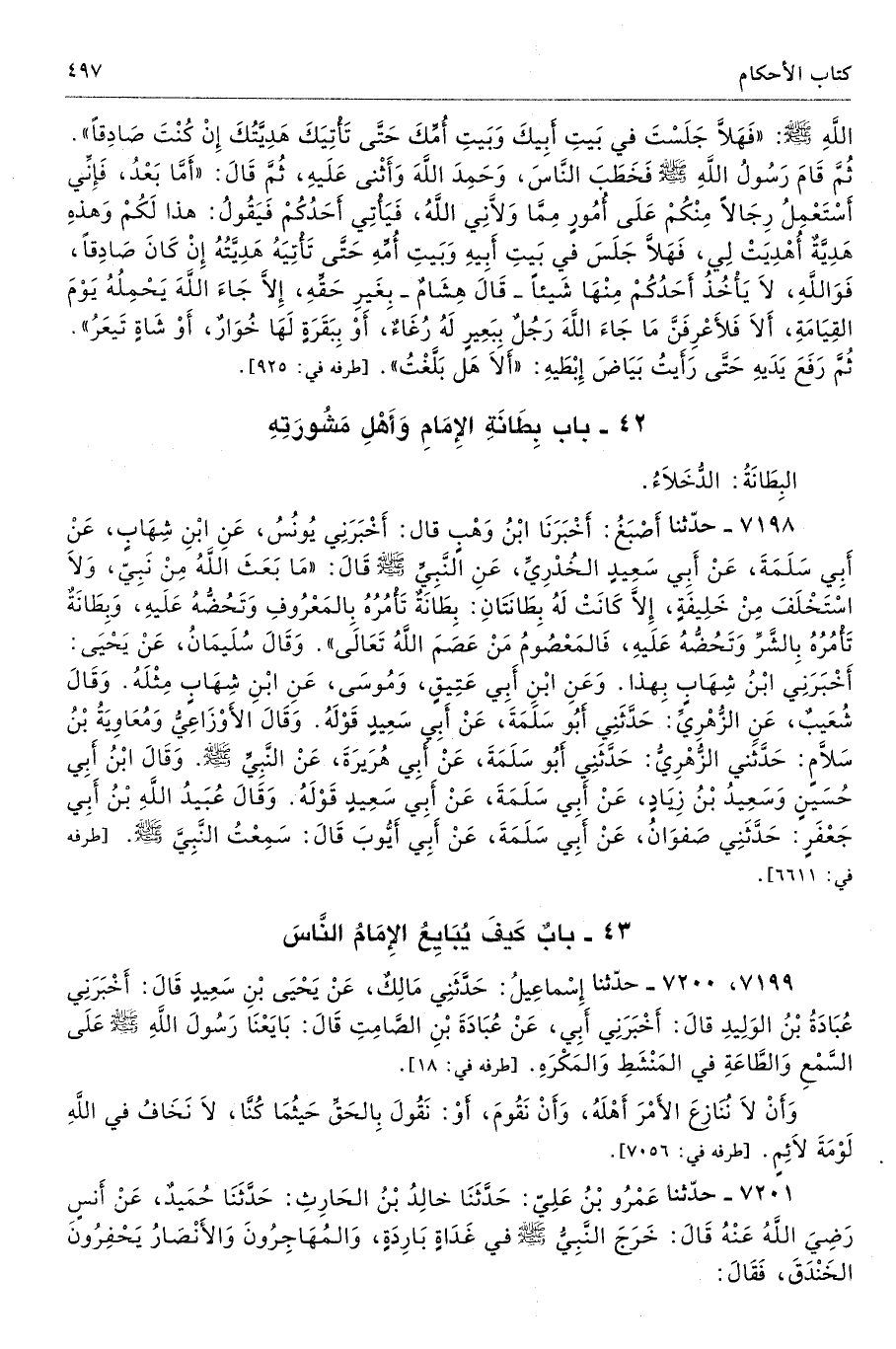 7199، 7200 - حَدَّثَنَا إِسْمَاعِيلُ حَدَّثَنِى مَالِكٌ عَنْ يَحْيَى بْنِ سَعِيدٍ قَالَ أَخْبَرَنِى عُبَادَةُ بْنُ الْوَلِيدِ أَخْبَرَنِى أَبِى عَنْ عُبَادَةَ بْنِ الصَّامِتِ قَالَ بَايَعْنَا رَسُولَ اللَّهِ - صلى الله عليه وسلم - عَلَى السَّمْعِ وَالطَّاعَةِ فِى الْمَنْشَطِ وَالْمَكْرَهِ. أطرافه 18، 3892، 3893، 3999، 4894، 6784، 6801، 6873، 7055، 7213، 7468 تحفة 5118