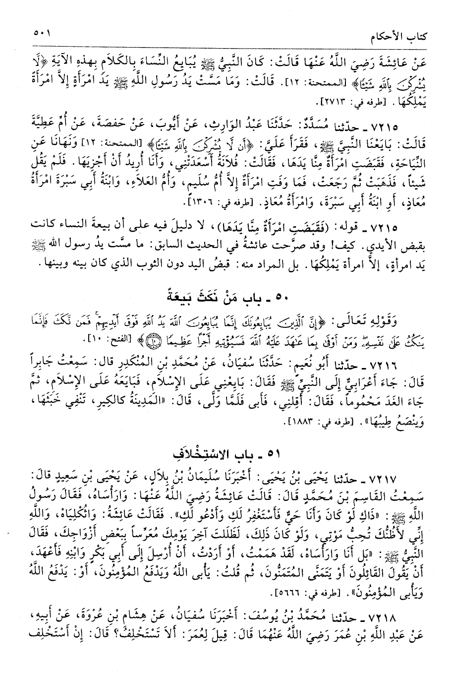 7215 - قوله: (فَقَبَضَتِ امْرَأَةٌ مِنَّا يَدَهَا)، لا دليلَ فيه على أن بيعةَ النساء كانت بقبض الأيدي. كيف! وقد صرَّحت عائشةُ في الحديث السابق: ما مسَّت يدُ رسول الله صلى الله عليه وسلّم يَد امرأةٍ، إلَّا امرأة يَمْلِكُهَا. بل المراد منه: قبضُ اليد دون الثوب الذي كان بينه وبينها.