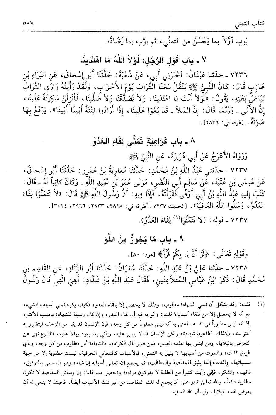 (¬1) قلت: وقد يشكل أن تمني الشهادة مطلوب، وذلك لا يحصل إلا بلقاء العدو، فكيف يكره تمني أسباب الشيء، مع أنه لا يحصل إلا من تلقاء أسبابه؟ قلت: والوجه فيه أن لقاء العدو، وإن كان وسيلة للشهادة بحسب الأكثر، إلا أنه ليس مطلوبًا في نفسه، أعني به أنه ليس مطلوبًا من كل وجه، فإن الإنسان قد يفر من الزحف فيتضرر به أكثر منه، وكذلك الطاعون شهادة، ولكن الإنسان قد لا يصبر عليه، ويأتي بما يعود وبالا عليه، فالشرع نهى عن التعرض بالبلايا، ومن ابتلى بها علمه الصبر، فمن صبر نال الكرامة، فالشهادة أمر مطلوب من كل وجه، وبأي طريق كانت، والموت من أسبابها لا يليق به التمني، فالأسباب كالمعاني الحرفية، ليست مطلوبة إلا من جهة مسبباتها، والدعاء إنما يليق للمقاصد والمطالب، ثم يجمع الله تعالى أسبابه إن شاء، وهو المسمى بالتوفيق، فافهم، وتشكر، فإني رأيت كثيرًا من الطلبة لا يدركون مراده؛ وتحصل مما قلنا: إن وسائل المقاصد لا تكون مطلوبة دائمًا، والله تعالى قادر على أن يجمع له تلك المقاصد من غير تلك الأسباب أيضًا، فحينئذ لا ينبغي له أن يعرض نفسه للبلايا، وليسأل الله العافية.
