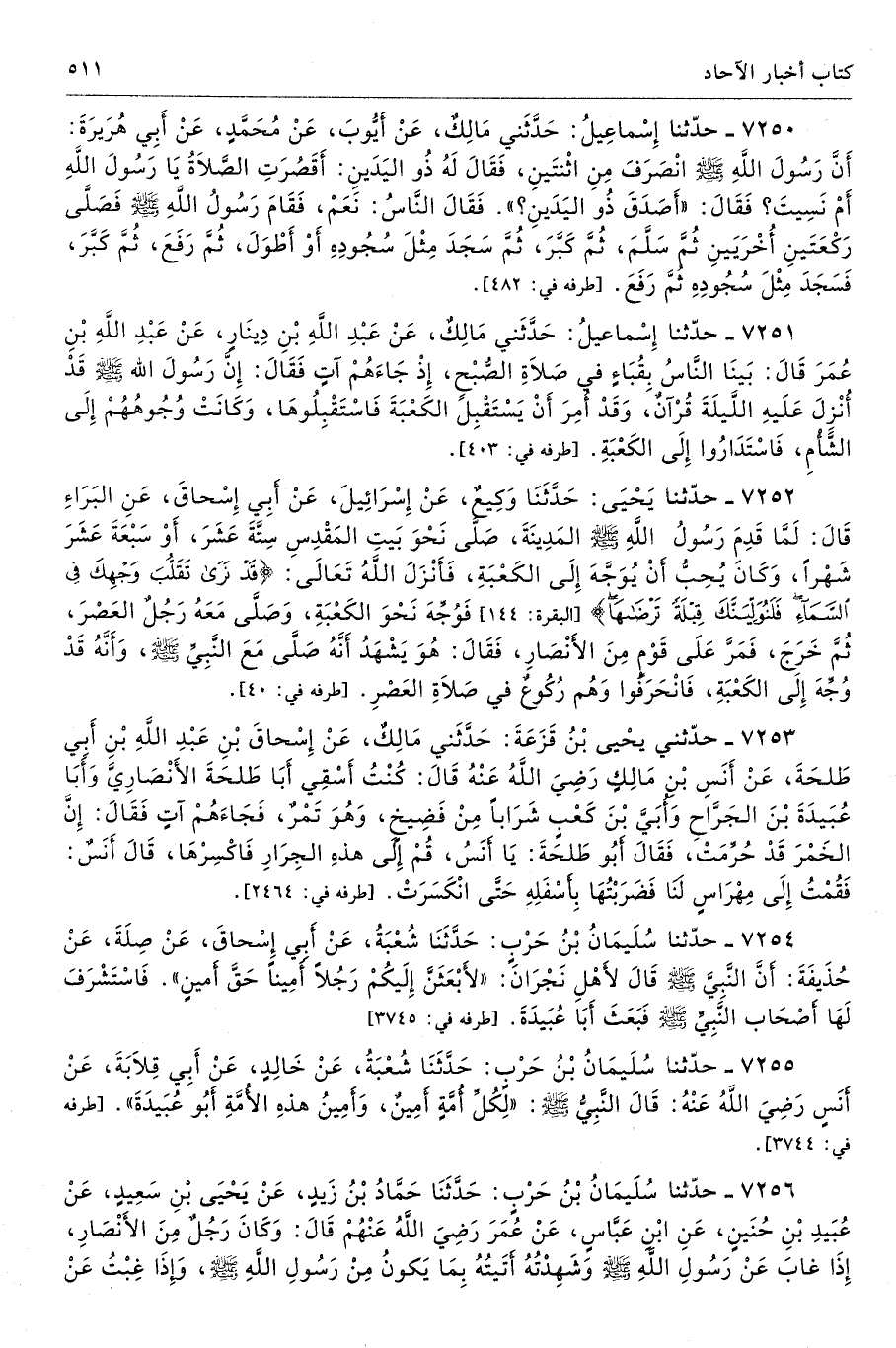7251 - حَدَّثَنَا إِسْمَاعِيلُ حَدَّثَنِى مَالِكٌ عَنْ عَبْدِ اللَّهِ بْنِ دِينَارٍ عَنْ عَبْدِ اللَّهِ بْنِ عُمَرَ قَالَ بَيْنَا النَّاسُ بِقُبَاءٍ فِى صَلاَةِ الصُّبْحِ إِذْ جَاءَهُمْ آتٍ فَقَالَ إِنَّ رَسُولَ اللَّهِ - صلى الله عليه وسلم - قَدْ أُنْزِلَ عَلَيْهِ اللَّيْلَةَ قُرْآنٌ، وَقَدْ أُمِرَ أَنْ يَسْتَقْبِلَ الْكَعْبَةَ فَاسْتَقْبِلُوهَا. وَكَانَتْ وُجُوهُهُمْ إِلَى الشَّأْمِ فَاسْتَدَارُوا إِلَى الْكَعْبَةِ. أطرافه 403، 4488، 4490، 4491، 4493، 4494 - تحفة 7228