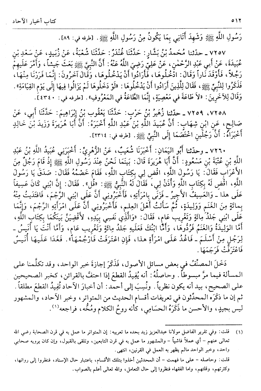 (¬1) قلت: وفي تقرير الفاضل مولانا عبدالعزيز زيد بحده ما تعريبه: إن المتواتر ما عمل به في قرن الصحابة رضي الله تعالى عنهم -أي عملًا فاشيًا- والمشهور ما عمل به في قرن التابعين، وتلقى بالقبول، وإن كان يرويه صحابي واحد، وخبر الواحد مالم يظهر به العمل في القرنين، انتهى.