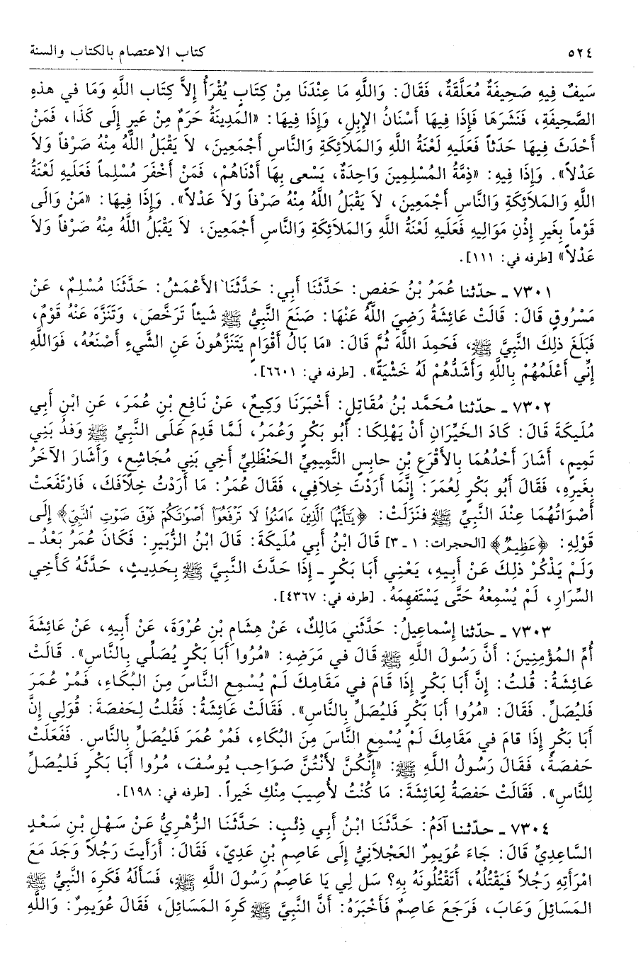سَيْفٌ فِيهِ صَحِيفَةٌ مُعَلَّقَةٌ فَقَالَ وَاللَّهِ مَا عِنْدَنَا مِنْ كِتَابٍ يُقْرَأُ إِلاَّ كِتَابُ اللَّهِ وَمَا فِى هَذِهِ الصَّحِيفَةِ. فَنَشَرَهَا فَإِذَا فِيهَا أَسْنَانُ الإِبِلِ وَإِذَا فِيهَا «الْمَدِينَةُ حَرَمٌ مِنْ عَيْرٍ إِلَى كَذَا، فَمَنْ أَحْدَثَ فِيهَا حَدَثًا فَعَلَيْهِ لَعْنَةُ اللَّهِ وَالْمَلاَئِكَةِ وَالنَّاسِ أَجْمَعِينَ، لاَ يَقْبَلُ اللَّهُ مِنْهُ صَرْفًا وَلاَ عَدْلاً». وَإِذَا فِيهِ «ذِمَّةُ الْمُسْلِمِينَ وَاحِدَةٌ يَسْعَى بِهَا أَدْنَاهُمْ، فَمَنْ أَخْفَرَ مُسْلِمًا فَعَلَيْهِ لَعْنَةُ اللَّهِ وَالْمَلاَئِكَةِ وَالنَّاسِ أَجْمَعِينَ، لاَ يَقْبَلُ اللَّهُ مِنْهُ صَرْفًا وَلاَ عَدْلاً». وَإِذَا فِيهَا «مَنْ وَالَى قَوْمًا بِغَيْرِ إِذْنِ مَوَالِيهِ فَعَلَيْهِ لَعْنَةُ اللَّهِ وَالْمَلاَئِكَةِ وَالنَّاسِ أَجْمَعِينَ لاَ يَقْبَلُ اللَّهُ مِنْهُ صَرْفًا وَلاَ عَدْلاً». أطرافه 111، 1870، 3047، 3172، 3179، 6755، 6903، 6915 تحفة 10317 - 120/ 9