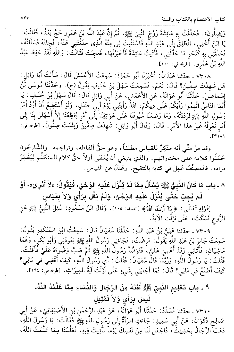 لِقَوْلِهِ تَعَالَى: {بِمَا أَرَاكَ اللَّهُ} [النساء: 105]. وَقَالَ ابْنُ مَسْعُودٍ: سُئِلَ النَّبِىُّ - صلى الله عليه وسلم - عَنِ الرُّوحِ فَسَكَتَ حَتَّى نَزَلَتِ الآيَةُ.