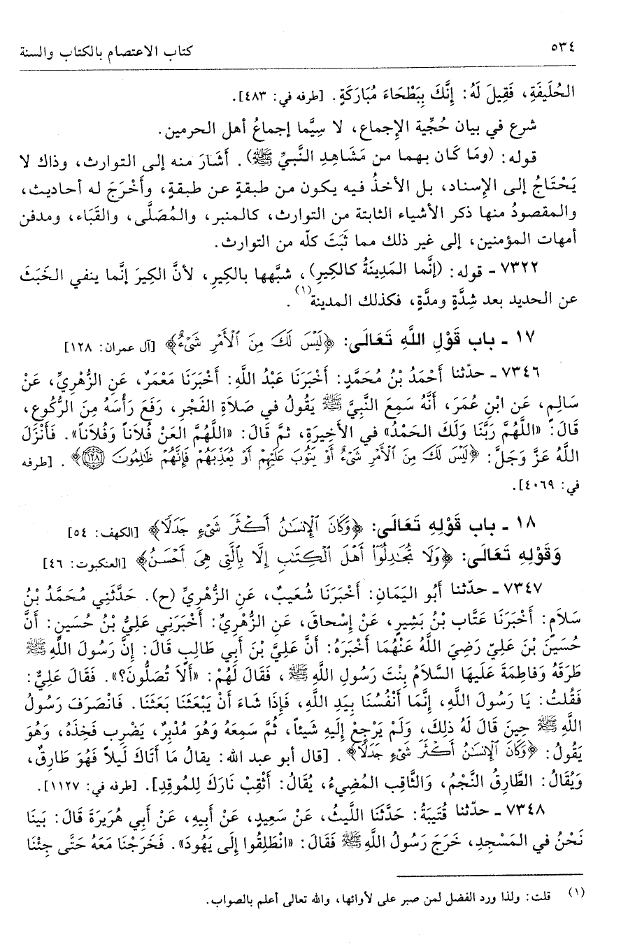 7347 - حَدَّثَنَا أَبُو الْيَمَانِ أَخْبَرَنَا شُعَيْبٌ عَنِ الزُّهْرِىِّ ح حَدَّثَنِى مُحَمَّدُ بْنُ سَلاَمٍ أَخْبَرَنَا عَتَّابُ بْنُ بَشِيرٍ عَنْ إِسْحَاقَ عَنِ الزُّهْرِىِّ أَخْبَرَنِى عَلِىُّ بْنُ حُسَيْنٍ أَنَّ حُسَيْنَ بْنَ عَلِىٍّ - رضى الله عنهما - أَخْبَرَهُ أَنَّ عَلِىَّ بْنَ أَبِى طَالِبٍ قَالَ إِنَّ رَسُولَ اللَّهِ - صلى الله عليه وسلم - طَرَقَهُ وَفَاطِمَةَ - عَلَيْهَا السَّلاَمُ - بِنْتَ رَسُولِ اللَّهِ - صلى الله عليه وسلم - فَقَالَ لَهُمْ «أَلاَ تُصَلُّونَ». فَقَالَ عَلِىٌّ فَقُلْتُ يَا رَسُولَ اللَّهِ إِنَّمَا أَنْفُسُنَا بِيَدِ اللَّهِ، فَإِذَا شَاءَ أَنْ يَبْعَثَنَا بَعَثَنَا، فَانْصَرَفَ رَسُولُ اللَّهِ - صلى الله عليه وسلم - حِينَ قَالَ لَهُ ذَلِكَ وَلَمْ يَرْجِعْ إِلَيْهِ شَيْئًا، ثُمَّ سَمِعَهُ وَهْوَ مُدْبِرٌ يَضْرِبُ فَخِذَهُ وَهْوَ يَقُولُ {وَكَانَ الْإِنْسَانُ أَكْثَرَ شَيْءٍ جَدَلًا}. قَالَ أَبُو عَبْدِ اللَّهِ يُقَالُ مَا أَتَاكَ لَيْلًا فَهْوَ طَارِقٌ. وَيُقَالُ الطَّارِقُ النَّجْمُ، وَالثَّاقِبُ الْمُضِىءُ، يُقَالُ أَثْقِبْ نَارَكَ لِلْمُوقِدِ. أطرافه 1127، 4724، 7465 - تحفة 10070