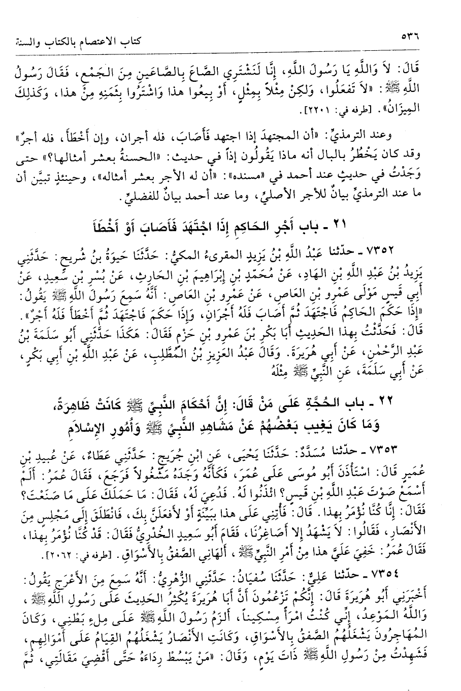 7352 - حَدَّثَنَا عَبْدُ اللَّهِ بْنُ يَزِيدَ حَدَّثَنَا حَيْوَةُ حَدَّثَنِى يَزِيدُ بْنُ عَبْدِ اللَّهِ بْنِ الْهَادِ عَنْ مُحَمَّدِ بْنِ إِبْرَاهِيمَ بْنِ الْحَارِثِ عَنْ بُسْرِ بْنِ سَعِيدٍ عَنْ أَبِى قَيْسٍ مَوْلَى عَمْرِو بْنِ الْعَاصِ عَنْ عَمْرِو بْنِ الْعَاصِ أَنَّهُ سَمِعَ رَسُولَ اللَّهِ - صلى الله عليه وسلم - يَقُولُ «إِذَا حَكَمَ الْحَاكِمُ فَاجْتَهَدَ ثُمَّ أَصَابَ فَلَهُ أَجْرَانِ، وَإِذَا حَكَمَ فَاجْتَهَدَ ثُمَّ أَخْطَأَ فَلَهُ أَجْرٌ». قَالَ فَحَدَّثْتُ بِهَذَا الْحَدِيثِ أَبَا بَكْرِ بْنَ عَمْرِو بْنِ حَزْمٍ فَقَالَ هَكَذَا حَدَّثَنِى أَبُو سَلَمَةَ بْنُ عَبْدِ الرَّحْمَنِ عَنْ أَبِى هُرَيْرَةَ. وَقَالَ عَبْدُ الْعَزِيزِ بْنُ الْمُطَّلِبِ عَنْ عَبْدِ اللَّهِ بْنِ أَبِى بَكْرٍ عَنْ أَبِى سَلَمَةَ عَنِ النَّبِىِّ - صلى الله عليه وسلم - مِثْلَهُ. تحفة 10748، 15437 - 133/ 9