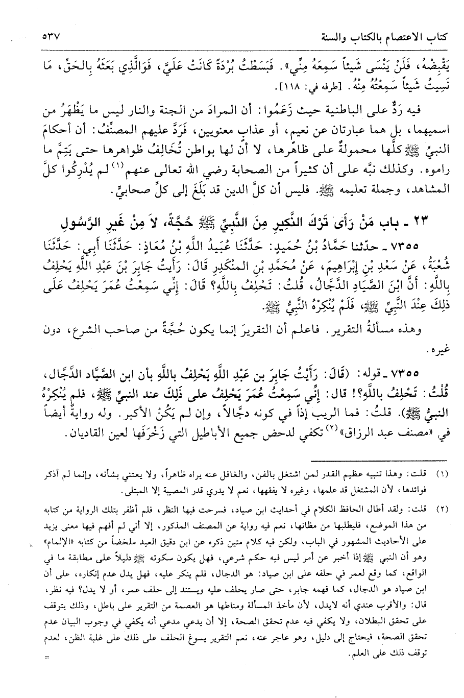 7355 - قوله: (قَالَ: رَأَيْتُ جَابِرَ بن عَبْدِ اللَّهِ يَحْلِفُ باللَّهِ بأن ابن الصَّيَّاد الدَّجَّال، قُلْتُ: تَحْلِفُ باللَّهِ؟ قال: إِنِّي سَمِعْتُ عُمَرَ يَحْلِفُ على ذَلِكَ عند النبيِّ صلى الله عليه وسلّم فم يُنْكِرْهُ النبيُّ صلى الله عليه وسلّم قلتُ: فما الريب إذًا في كونه دجَّالًا، وإن لم يَكُنْ الأكبر. وله روايةٌ أيضًا في «مصنف عبد الرزاق» (¬2) تكفي لدحض جميع الأباطيل التي زَخْرَفَها لعين القاديان.