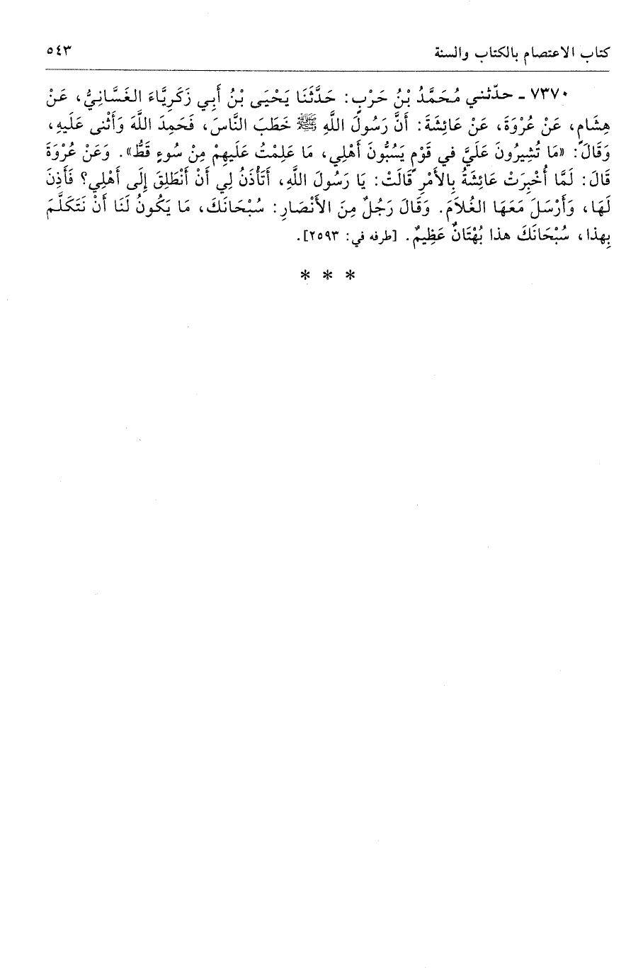 7370 - حَدَّثَنِى مُحَمَّدُ بْنُ حَرْبٍ حَدَّثَنَا يَحْيَى بْنُ أَبِى زَكَرِيَّاءَ الْغَسَّانِىُّ عَنْ هِشَامٍ عَنْ عُرْوَةَ عَنْ عَائِشَةَ أَنَّ رَسُولَ اللَّهِ - صلى الله عليه وسلم - خَطَبَ النَّاسَ فَحَمِدَ اللَّهَ وَأَثْنَى عَلَيْهِ وَقَالَ «مَا تُشِيرُونَ عَلَىَّ فِى قَوْمٍ يَسُبُّونَ أَهْلِى مَا عَلِمْتُ عَلَيْهِمْ مِنْ سُوءٍ قَطُّ». وَعَنْ عُرْوَةَ قَالَ لَمَّا أُخْبِرَتْ عَائِشَةُ بِالأَمْرِ قَالَتْ يَا رَسُولَ اللَّهِ أَتَأْذَنُ لِى أَنْ أَنْطَلِقَ إِلَى أَهْلِى. فَأَذِنَ لَهَا وَأَرْسَلَ مَعَهَا الْغُلاَمَ. وَقَالَ رَجُلٌ مِنَ الأَنْصَارِ سُبْحَانَكَ مَا يَكُونُ لَنَا أَنْ نَتَكَلَّمَ بِهَذَا، سُبْحَانَكَ هَذَا بُهْتَانٌ عَظِيمٌ. أطرافه 2593، 2637، 2661، 2688، 2879، 4025، 4141، 4690، 4749، 4750، 4757، 5212، 6662، 6679، 7369، 7500، 7545 - تحفة 17302 ے