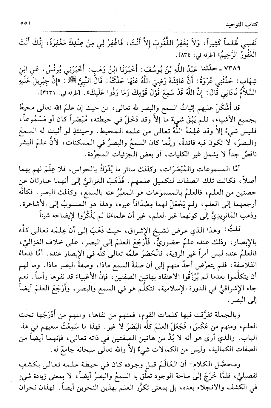 قد أَشْكَلَ عليهم إثباتُ السمع والبصر تعالى، من حيث أن علمَ الله تعالى محيطٌ بجميع الأشياء، فلم يَبْقَ شيءٌ ما إلَّا وقد دَخَلَ في حيطته، مُبْصَرًا كان أو مَسْمُوعًا، فليس شيءٌ إلَّا وقد عَلِمَهُ اللهُ تعالى من علمه المحيط. وحينئذٍ لو أثبتنا له السمعَ والبصرَ، لا تكون فيه فائدةٌ، وإنَّما كان السمعُ والبصرُ في الممكنات، لأنَّ علمَ البشر ناقصٌ جدًا لا يشمل غير الكليات، أو بعض الجزئيات المجرَّدة.