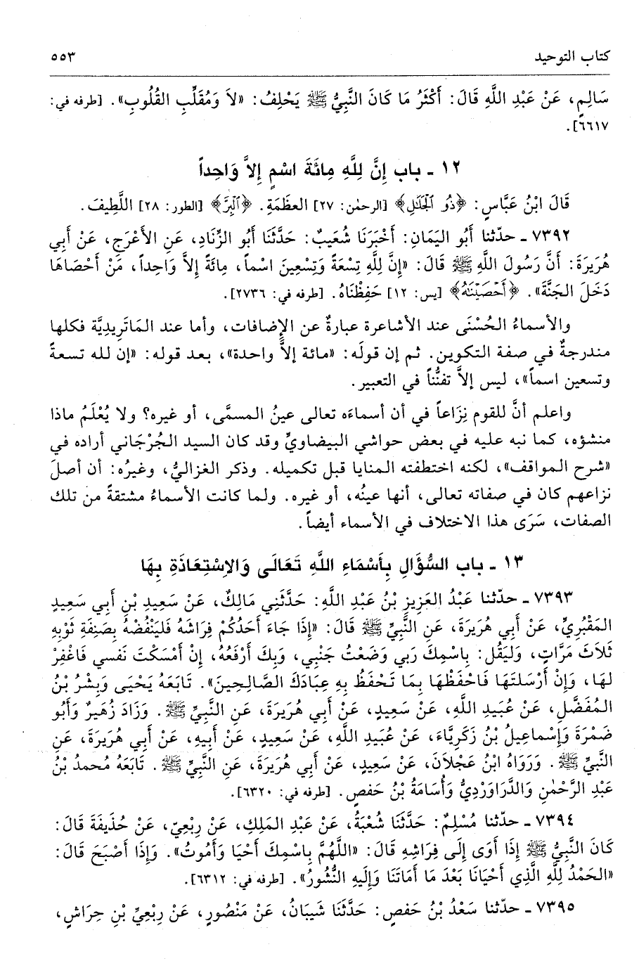 7392 - حَدَّثَنَا أَبُو الْيَمَانِ أَخْبَرَنَا شُعَيْبٌ حَدَّثَنَا أَبُو الزِّنَادِ عَنِ الأَعْرَجِ عَنْ أَبِى هُرَيْرَةَ أَنَّ رَسُولَ اللَّهِ - صلى الله عليه وسلم - قَالَ «إِنَّ لِلَّهِ تِسْعَةً وَتِسْعِينَ اسْمًا مِائَةً إِلاَّ وَاحِدًا، مَنْ أَحْصَاهَا دَخَلَ الْجَنَّةَ». {أَحْصَيْنَاهُ} [يس: 12] حَفِظْنَاهُ. طرفاه 2736، 6410 - تحفة 13727