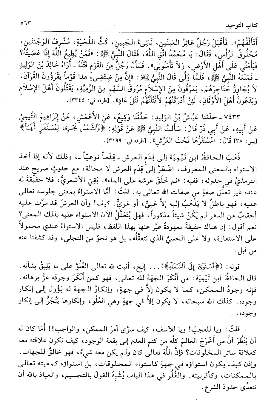 قلتُ: ويا للعجبَ ويا للأسف، كيف سوَّى أمرَ الممكن، والواجب؟ أَمَا كان له أن يَنْظُرَ أنَّ من أَخْرَجَ العالمَ كلَّه من كتم العدم إلى بقعة الوجود، كيف تكون علاقته معه كعلاقة سائر المخلوقات؟ فإنَّ اللَّهَ تعالى كان ولم يكن معه شيءٌ، فهو خالقٌ للجهات. وإذن كيف يكون استواؤه في جهةٍ كاستواء المخلوقات، بل استواؤه كمعيته تعالى بالممكنات، وكأقربيته. والغُلُو في هذا الباب يُشْبِهُ القولَ بالتجسيم، والعياذ بالله أن نتعدَّى حدودَ الشرع.