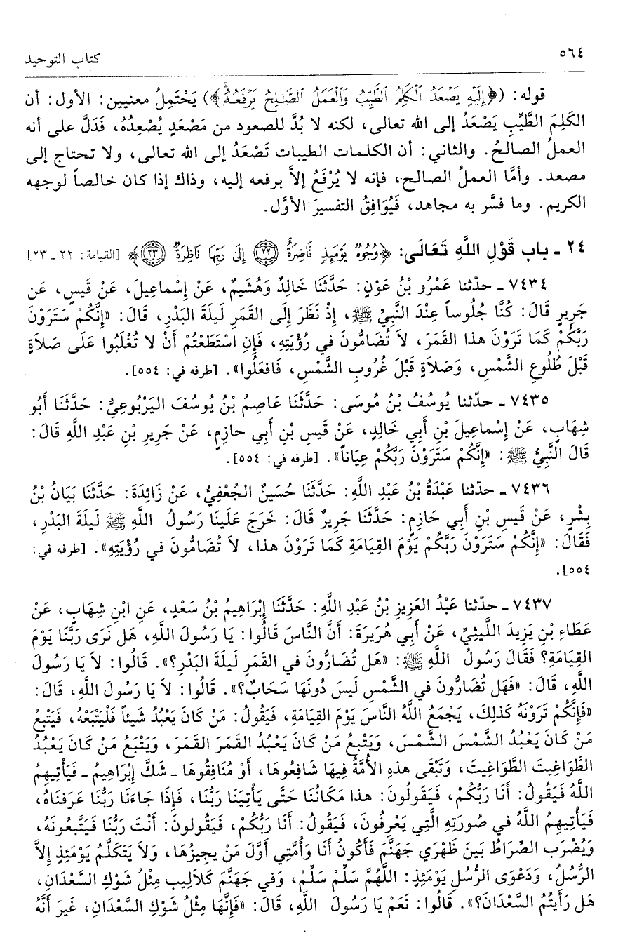 7436 - حَدَّثَنَا عَبْدَةُ بْنُ عَبْدِ اللَّهِ حَدَّثَنَا حُسَيْنٌ الْجُعْفِىُّ عَنْ زَائِدَةَ حَدَّثَنَا بَيَانُ بْنُ بِشْرٍ عَنْ قَيْسِ بْنِ أَبِى حَازِمٍ حَدَّثَنَا جَرِيرٌ قَالَ خَرَجَ عَلَيْنَا رَسُولُ اللَّهِ - صلى الله عليه وسلم - لَيْلَةَ الْبَدْرِ فَقَالَ «إِنَّكُمْ سَتَرَوْنَ رَبَّكُمْ يَوْمَ الْقِيَامَةِ كَمَا تَرَوْنَ هَذَا، لاَ تُضَامُّونَ فِى رُؤْيَتِهِ». أطرافه 554، 573، 4851، 7434، 7435 - تحفة 3223
