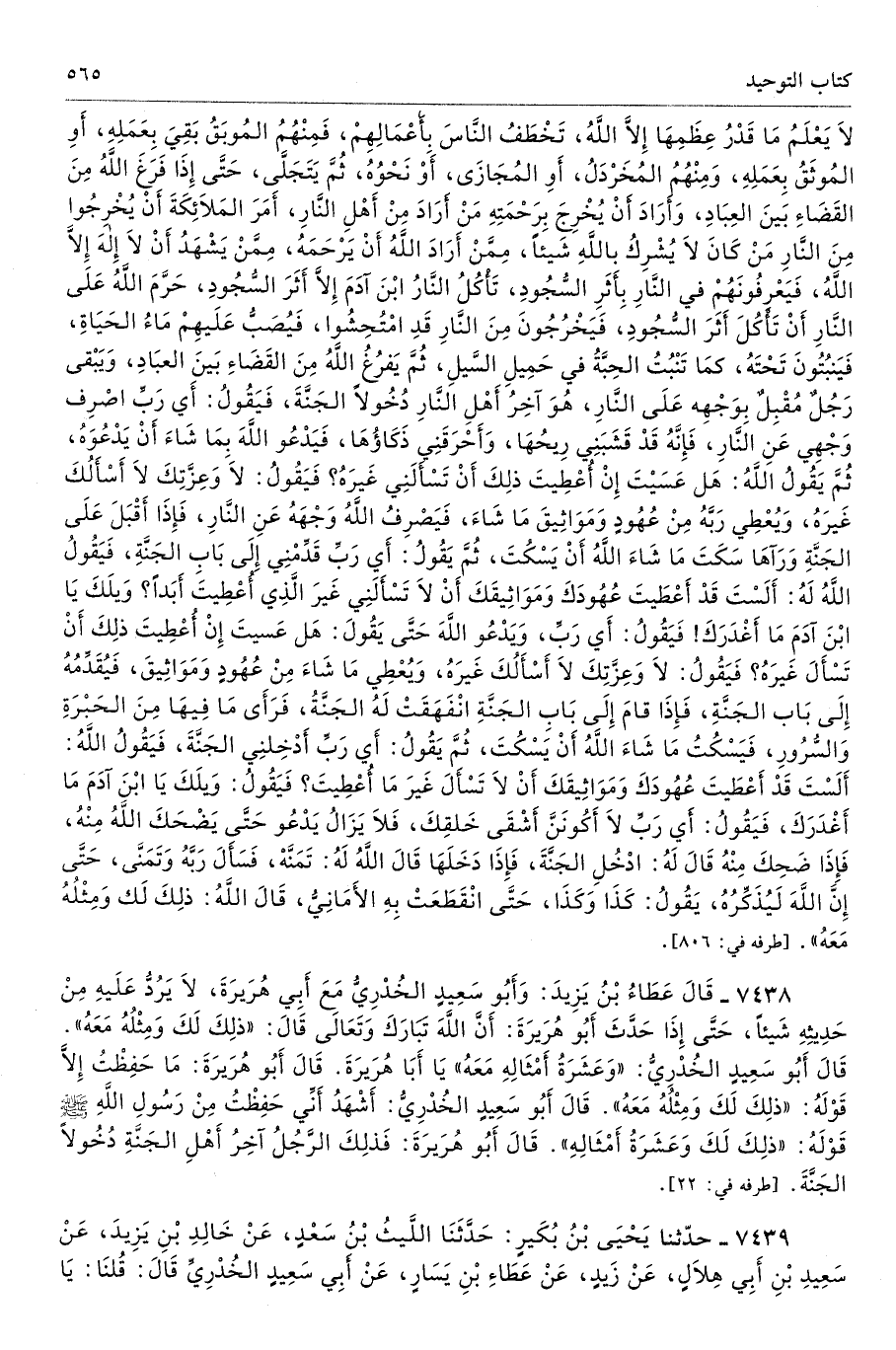 7439 - حَدَّثَنَا يَحْيَى بْنُ بُكَيْرٍ حَدَّثَنَا اللَّيْثُ عَنْ خَالِدِ بْنِ يَزِيدَ عَنْ سَعِيدِ بْنِ أَبِى هِلاَلٍ عَنْ زَيْدٍ عَنْ عَطَاءِ بْنِ يَسَارٍ عَنْ أَبِى سَعِيدٍ الْخُدْرِىِّ قَالَ قُلْنَا يَا