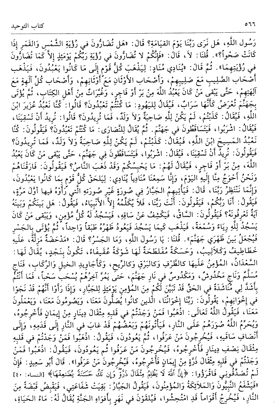 رَسُولَ اللَّهِ هَلْ نَرَى رَبَّنَا يَوْمَ الْقِيَامَةِ قَالَ «هَلْ تُضَارُونَ فِى رُؤْيَةِ الشَّمْسِ وَالْقَمَرِ إِذَا كَانَتْ صَحْوًا». قُلْنَا لاَ. قَالَ «فَإِنَّكُمْ لاَ تُضَارُونَ فِى رُؤْيَةِ رَبِّكُمْ يَوْمَئِذٍ، إِلاَّ كَمَا تُضَارُونَ فِى رُؤْيَتِهِمَا - ثُمَّ قَالَ - يُنَادِى مُنَادٍ لِيَذْهَبْ كُلُّ قَوْمٍ إِلَى مَا كَانُوا يَعْبُدُونَ. فَيَذْهَبُ أَصْحَابُ الصَّلِيبِ مَعَ صَلِيبِهِمْ، وَأَصْحَابُ الأَوْثَانِ مَعَ أَوْثَانِهِمْ، وَأَصْحَابُ كُلِّ آلِهَةٍ مَعَ آلِهَتِهِمْ حَتَّى يَبْقَى مَنْ كَانَ يَعْبُدُ اللَّهَ مِنْ بَرٍّ أَوْ فَاجِرٍ، وَغُبَّرَاتٌ مِنْ أَهْلِ الْكِتَابِ، ثُمَّ يُؤْتَى بِجَهَنَّمَ تُعْرَضُ كَأَنَّهَا سَرَابٌ فَيُقَالُ لِلْيَهُودِ مَا كُنْتُمْ تَعْبُدُونَ قَالُوا كُنَّا نَعْبُدُ عُزَيْرَ ابْنَ اللَّهِ. فَيُقَالُ كَذَبْتُمْ لَمْ يَكُنْ لِلَّهِ صَاحِبَةٌ وَلاَ وَلَدٌ فَمَا تُرِيدُونَ قَالُوا نُرِيدُ أَنْ تَسْقِيَنَا، فَيُقَالُ اشْرَبُوا فَيَتَسَاقَطُونَ فِى جَهَنَّمَ ثُمَّ يُقَالُ لِلنَّصَارَى مَا كُنْتُمْ تَعْبُدُونَ فَيَقُولُونَ كُنَّا نَعْبُدُ الْمَسِيحَ ابْنَ اللَّهِ. فَيُقَالُ كَذَبْتُمْ لَمْ يَكُنْ لِلَّهِ صَاحِبَةٌ وَلاَ وَلَدٌ، فَمَا تُرِيدُونَ فَيَقُولُونَ نُرِيدُ أَنْ تَسْقِيَنَا. فَيُقَالُ اشْرَبُوا. فَيَتَسَاقَطُونَ حَتَّى يَبْقَى مَنْ كَانَ يَعْبُدُ اللَّهَ مِنْ بَرٍّ أَوْ فَاجِرٍ فَيُقَالُ لَهُمْ مَا يَحْبِسُكُمْ وَقَدْ ذَهَبَ النَّاسُ فَيَقُولُونَ فَارَقْنَاهُمْ وَنَحْنُ أَحْوَجُ مِنَّا إِلَيْهِ الْيَوْمَ وَإِنَّا سَمِعْنَا مُنَادِيًا يُنَادِى لِيَلْحَقْ كُلُّ قَوْمٍ بِمَا كَانُوا يَعْبُدُونَ. وَإِنَّمَا نَنْتَظِرُ رَبَّنَا - قَالَ - فَيَأْتِيهِمُ الْجَبَّارُ. فَيَقُولُ أَنَا رَبُّكُمْ. فَيَقُولُونَ أَنْتَ رَبُّنَا. فَلاَ يُكَلِّمُهُ إِلاَّ الأَنْبِيَاءُ فَيَقُولُ هَلْ بَيْنَكُمْ وَبَيْنَهُ آيَةٌ تَعْرِفُونَهُ فَيَقُولُونَ السَّاقُ. فَيَكْشِفُ عَنْ سَاقِهِ فَيَسْجُدُ لَهُ كُلُّ مُؤْمِنٍ، وَيَبْقَى مَنْ كَانَ يَسْجُدُ لِلَّهِ رِيَاءً وَسُمْعَةً، فَيَذْهَبُ كَيْمَا يَسْجُدَ فَيَعُودُ ظَهْرُهُ طَبَقًا وَاحِدًا، ثُمَّ يُؤْتَى بِالْجَسْرِ فَيُجْعَلُ بَيْنَ ظَهْرَىْ جَهَنَّمَ». قُلْنَا يَا رَسُولَ اللَّهِ وَمَا الْجَسْرُ قَالَ «مَدْحَضَةٌ مَزِلَّةٌ، عَلَيْهِ خَطَاطِيفُ وَكَلاَلِيبُ وَحَسَكَةٌ مُفَلْطَحَةٌ، لَهَا شَوْكَةٌ عُقَيْفَاءُ تَكُونُ بِنَجْدٍ يُقَالُ لَهَا السَّعْدَانُ، الْمُؤْمِنُ عَلَيْهَا كَالطَّرْفِ وَكَالْبَرْقِ وَكَالرِّيحِ وَكَأَجَاوِيدِ الْخَيْلِ وَالرِّكَابِ، فَنَاجٍ مُسَلَّمٌ وَنَاجٍ مَخْدُوشٌ وَمَكْدُوسٌ فِى نَارِ جَهَنَّمَ، حَتَّى يَمُرَّ آخِرُهُمْ يُسْحَبُ سَحْبًا، فَمَا أَنْتُمْ بِأَشَدَّ لِى مُنَاشَدَةً فِى الْحَقِّ، قَدْ تَبَيَّنَ لَكُمْ مِنَ الْمُؤْمِنِ يَوْمَئِذٍ لِلْجَبَّارِ، وَإِذَا رَأَوْا أَنَّهُمْ قَدْ نَجَوْا فِى إِخْوَانِهِمْ يَقُولُونَ رَبَّنَا إِخْوَانُنَا كَانُوا يُصَلُّونَ مَعَنَا وَيَصُومُونَ مَعَنَا وَيَعْمَلُونَ مَعَنَا. فَيَقُولُ اللَّهُ تَعَالَى اذْهَبُوا فَمَنْ وَجَدْتُمْ فِى قَلْبِهِ مِثْقَالَ دِينَارٍ مِنْ إِيمَانٍ فَأَخْرِجُوهُ. وَيُحَرِّمُ اللَّهُ صُوَرَهُمْ عَلَى النَّارِ، فَيَأْتُونَهُمْ وَبَعْضُهُمْ قَدْ غَابَ فِى النَّارِ إِلَى قَدَمِهِ وَإِلَى أَنْصَافِ سَاقَيْهِ، فَيُخْرِجُونَ مَنْ عَرَفُوا، ثُمَّ يَعُودُونَ فَيَقُولُ اذْهَبُوا فَمَنْ وَجَدْتُمْ فِى قَلْبِهِ مِثْقَالَ نِصْفِ دِينَارٍ فَأَخْرِجُوهُ. فَيُخْرِجُونَ مَنْ عَرَفُوا، ثُمَّ يَعُودُونَ فَيَقُولُ اذْهَبُوا فَمَنْ وَجَدْتُمْ فِى قَلْبِهِ مِثْقَالَ ذَرَّةٍ مِنْ إِيمَانٍ فَأَخْرِجُوهُ. فَيُخْ