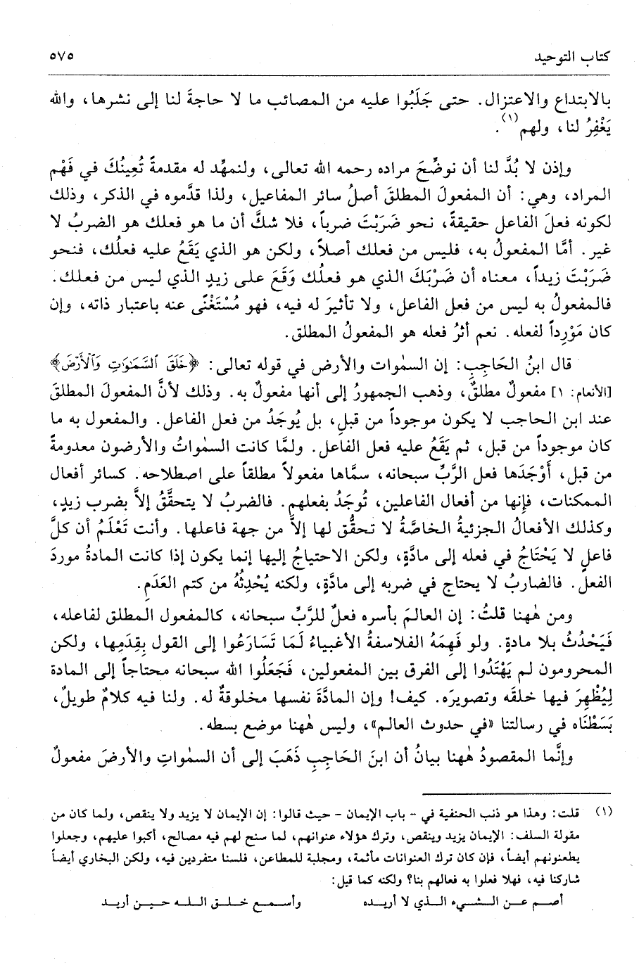 قال ابنُ الحَاجِبِ: إن السماوات والأرض في قوله تعالى: {خَلَقَ السَّمَاوَاتِ وَالْأَرْضَ} [الأنعام: 1] مفعولٌ مطلقٌ، وذهب الجمهورُ إلى أنها مفعولٌ به. وذلك لأنَّ المفعولَ المطلقَ عند ابن الحاجب لا يكون موجودًا من قبلِ، بل يُوجَدُ من فعل الفاعل. والمفعول به ما كان موجودًا من قبل، ثم يَقَعُ عليه فعل الفاعل. ولمَّا كانت السمواتُ والأرضون معدومةً من قبل، أَوْجَدَها فعل الرَّبِّ سبحانه، سمَّاها مفعولًا مطلقًا على اصطلاحه. كسائر أفعال الممكنات، فإِنها من أفعال الفاعلين، تُوجَدُ بفعلهم. فالضربُ لا يتحقَّقُ إلَّا بضرب زيدٍ، وكذلك الأفعالُ الجزئيةُ الخاصَّةُ لا تحقُّق لها إلَّا من جهة فاعلها. وأنت تَعْلَمُ أن كلَّ فاعلٍ لا يَحْتَاجُ في فعله إلى مادَّةٍ، ولكن الاحتياجُ إليها إنما يكون إذا كانت المادةُ موردَ الفعل. فالضاربُ لا يحتاج في ضربه إلى مادَّةٍ، ولكنه يُحْدِثُهُ من كتم العَدَمِ.