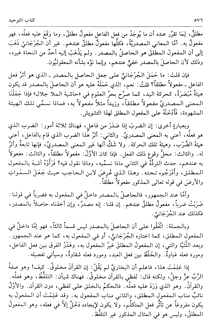 إذا عَلِمْتَ هذا، فاعلم أن البخاريَّ لم يَقُلْ: إن القرآنَ مخلوقٌ. كيف وهو صفةُ الرَّبِّ عزَّ وجلَّ، ولكنه قال: لفظي بالقرآن مخلوقٌ. فهناك شيآن: التلفُّظُ، وهو فعلُه. والقرآنُ. وهو الذي وَرَدَ عليه فعلُه. فالحكمُ بالخلق على لفظي، دون القرآن. والأوَّلُ نائبٌ مناب المفعول المطلق، والثاني مناب المفعول به. وقد عَلِمْتَ أن المفعولَ به يكون مفروغًا عن تأثُّر فعل المتكلِّم، ولا يكون لإِيجاده دَخْلٌ إلَّا في فعله، وهو المفعولُ المطلقُ، وليس هو في المثال المذكور غير التلفُّظ.