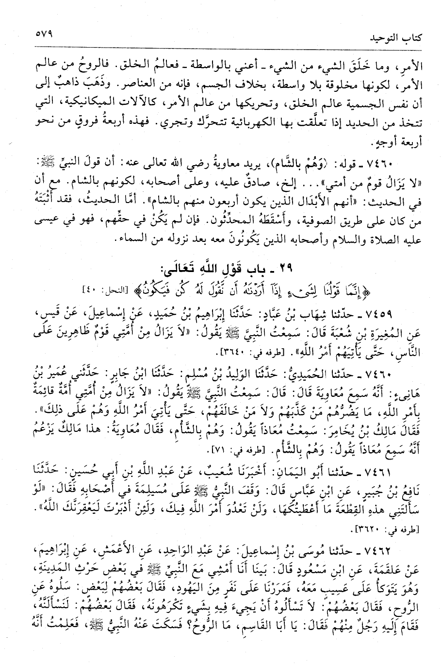 7460 - قوله: (وَهُمْ بالشَّام)، يريد معاويةُ رضي الله تعالى عنه: أن قولَ النبيِّ صلى الله عليه وسلّم «لا يَزَالُ قومٌ من أمتي» ... إلخ، صادقٌ عليه، وعلى أصحابه، لكونهم بالشام. مع أن في الحديث: «أنهم الأَبْدَال الذين يكون أربعون منهم بالشام». أمَّا الحديثُ، فقد أَثْبَتَهُ من كان على طريق الصوفية، وأَسْقَطَهُ المحدِّثُون. فإن لم يَكُنْ في حقِّهم، فهو في عيسى عليه الصلاة والسلام وأصحابه الذين يَكُونُونَ معه بعد نزوله من السماء.