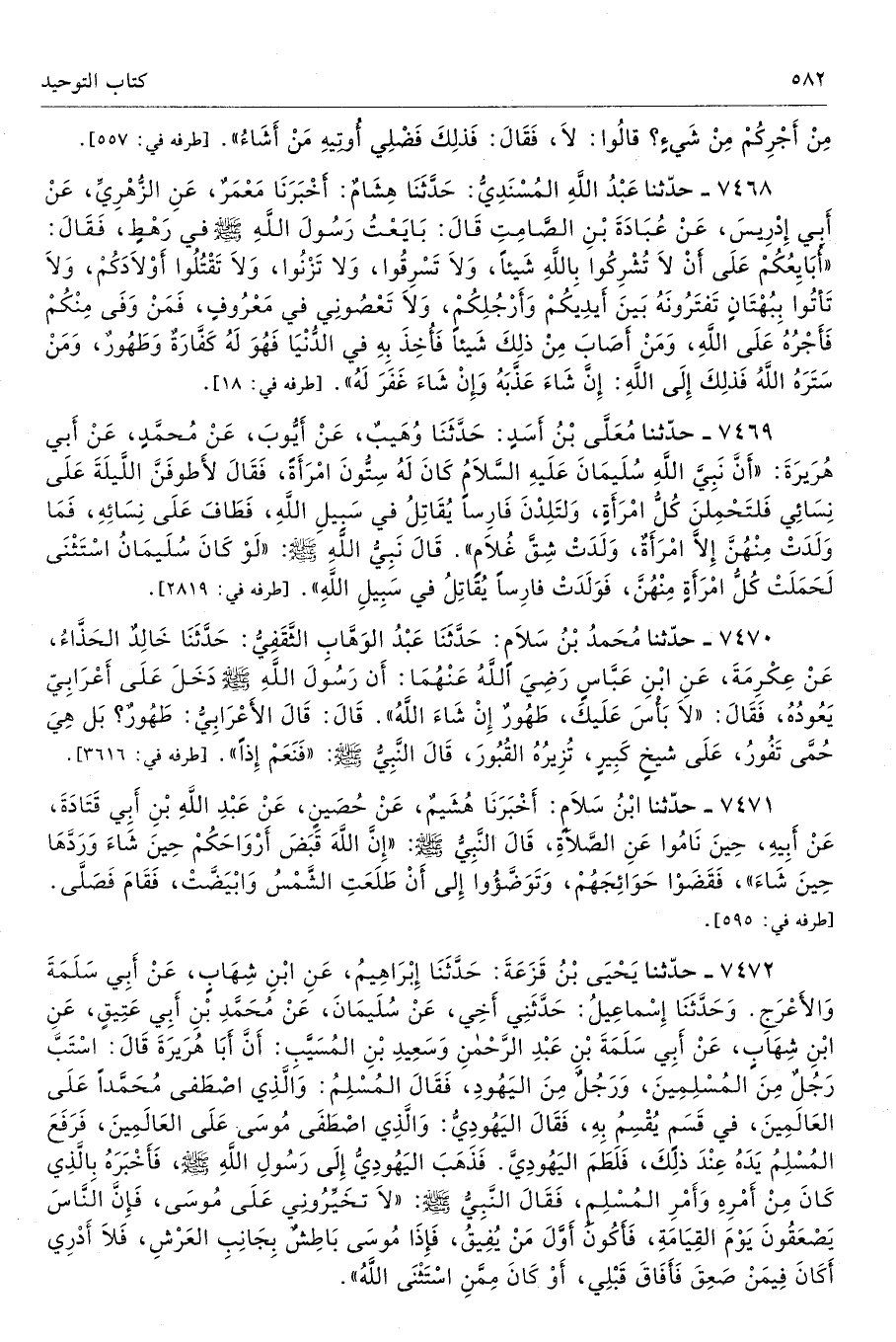 7468 - حَدَّثَنَا عَبْدُ اللَّهِ الْمُسْنَدِىُّ حَدَّثَنَا هِشَامٌ أَخْبَرَنَا مَعْمَرٌ عَنِ الزُّهْرِىِّ عَنْ أَبِى إِدْرِيسَ عَنْ عُبَادَةَ بْنِ الصَّامِتِ قَالَ بَايَعْتُ رَسُولَ اللَّهِ - صلى الله عليه وسلم - فِى رَهْطٍ فَقَالَ «أُبَايِعُكُمْ عَلَى أَنْ لاَ تُشْرِكُوا بِاللَّهِ شَيْئًا، وَلاَ تَسْرِقُوا، وَلاَ تَزْنُوا، وَلاَ تَقْتُلُوا أَوْلاَدَكُمْ، وَلاَ تَأْتُوا بِبُهْتَانٍ تَفْتَرُونَهُ بَيْنَ أَيْدِيكُمْ وَأَرْجُلِكُمْ وَلاَ تَعْصُونِى فِى مَعْرُوفٍ، فَمَنْ وَفَى مِنْكُمْ فَأَجْرُهُ عَلَى اللَّهِ، وَمَنْ أَصَابَ مِنْ ذَلِكَ شَيْئًا فَأُخِذَ بِهِ فِى الدُّنْيَا فَهْوَ لَهُ كَفَّارَةٌ وَطَهُورٌ، وَمَنْ سَتَرَهُ اللَّهُ فَذَلِكَ إِلَى اللَّهِ إِنْ شَاءَ عَذَّبَهُ وَإِنْ شَاءَ غَفَرَ لَهُ». أطرافه 18، 3892، 3893، 3999، 4894، 6784، 6801، 6873، 7055، 7199، 7213 - تحفة 5094