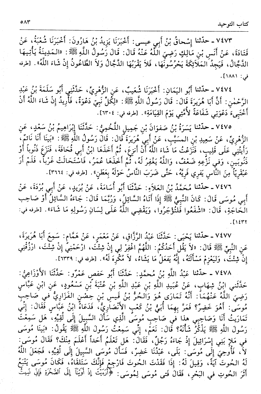 7478 - حَدَّثَنَا عَبْدُ اللَّهِ بْنُ مُحَمَّدٍ حَدَّثَنَا أَبُو حَفْصٍ عَمْرٌو حَدَّثَنَا الأَوْزَاعِىُّ حَدَّثَنِى ابْنُ شِهَابٍ عَنْ عُبَيْدِ اللَّهِ بْنِ عَبْدِ اللَّهِ بْنِ عُتْبَةَ بْنِ مَسْعُودٍ عَنِ ابْنِ عَبَّاسٍ - رضى الله عنهما - أَنَّهُ تَمَارَى هُوَ وَالْحُرُّ بْنُ قَيْسِ بْنِ حِصْنٍ الْفَزَارِىُّ فِى صَاحِبِ مُوسَى أَهُوَ خَضِرٌ، فَمَرَّ بِهِمَا أُبَىُّ بْنُ كَعْبٍ الأَنْصَارِىُّ، فَدَعَاهُ ابْنُ عَبَّاسٍ فَقَالَ إِنِّى تَمَارَيْتُ أَنَا وَصَاحِبِى هَذَا فِى صَاحِبِ مُوسَى الَّذِى سَأَلَ السَّبِيلَ إِلَى لُقِيِّهِ، هَلْ سَمِعْتَ رَسُولَ اللَّهِ - صلى الله عليه وسلم - يَذْكُرُ شَأْنَهُ قَالَ نَعَمْ إِنِّى سَمِعْتُ رَسُولَ اللَّهِ - صلى الله عليه وسلم - يَقُولُ «بَيْنَا مُوسَى فِى مَلإِ بَنِى إِسْرَائِيلَ إِذْ جَاءَهُ رَجُلٌ فَقَالَ هَلْ تَعْلَمُ أَحَدًا أَعْلَمَ مِنْكَ فَقَالَ مُوسَى لاَ. فَأُوحِىَ إِلَى مُوسَى بَلَى عَبْدُنَا خَضِرٌ. فَسَأَلَ مُوسَى السَّبِيلَ إِلَى لُقِيِّهِ، فَجَعَلَ اللَّهُ لَهُ الْحُوتَ آيَةً وَقِيلَ لَهُ إِذَا فَقَدْتَ الْحُوتَ فَارْجِعْ فَإِنَّكَ سَتَلْقَاهُ. فَكَانَ مُوسَى يَتْبَعُ أَثَرَ الْحُوتِ فِى الْبَحْرِ فَقَالَ فَتَى مُوسَى لِمُوسَى {قَالَ أَرَأَيْتَ إِذْ أَوَيْنَا إِلَى الصَّخْرَةِ فَإِنِّي نَسِيتُ