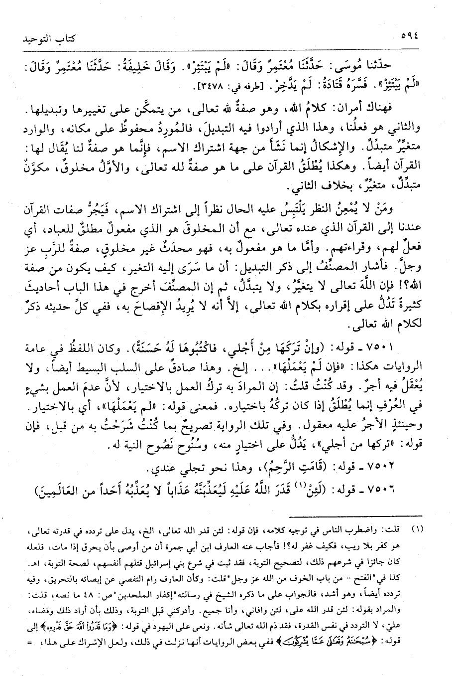 ومَنْ لا يُمْعِنُ النظر يَلْتَبِسُ عليه الحال نظرًا إلى اشتراك الاسم، فَيَجُرُّ صفات القرآن عندنا إلى القرآن الذي عنده تعالى، مع أن المخلوقَ هو الذي مفعولٌ مطلقٌ للعباد، أي فعلٌ لهم، وقراءتهم. وأمَّا ما هو مفعولٌ به، فهو محدَثٌ غير مخلوقٍ، صفةٌ للرَّبِ عز وجلَّ. فأشار المصنِّفُ إلى ذكر التبديل: أن ما سَرَى إليه التغير، كيف يكون من صفة الله؟ فإن اللَّهَ تعالى لا يتغيَّرُ، ولا يتبدَّلُ، ثم إن المصنِّفَ أخرج في هذا الباب أحاديثَ كثيرةً تَدُلُّ على إقراره بكلام الله تعالى، إلَّا أنه لا يُرِيدُ الإِفصاحَ به، ففي كلِّ حديثه ذكرٌ لكلام الله تعالى.