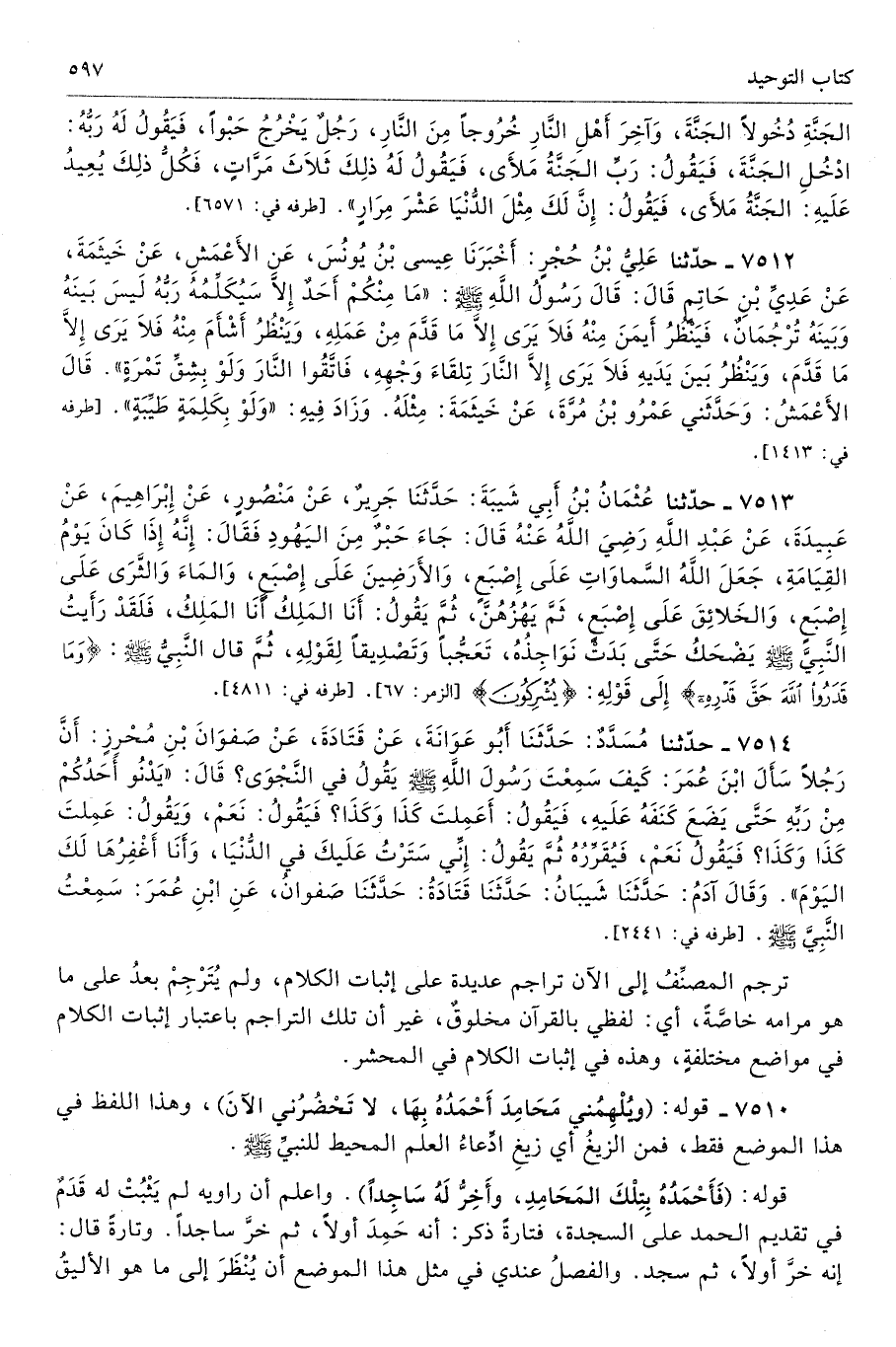 7512 - حَدَّثَنَا عَلِىُّ بْنُ حُجْرٍ أَخْبَرَنَا عِيسَى بْنُ يُونُسَ عَنِ الأَعْمَشِ عَنْ خَيْثَمَةَ عَنْ عَدِىِّ بْنِ حَاتِمٍ قَالَ قَالَ رَسُولُ اللَّهِ - صلى الله عليه وسلم - «مَا مِنْكُمْ أَحَدٌ إِلاَّ سَيُكَلِّمُهُ رَبُّهُ، لَيْسَ بَيْنَهُ وَبَيْنَهُ تَرْجُمَانٌ، فَيَنْظُرُ أَيْمَنَ مِنْهُ فَلاَ يَرَى إِلاَّ مَا قَدَّمَ مِنْ عَمَلِهِ، وَيَنْظُرُ أَشْأَمَ مِنْهُ فَلاَ يَرَى إِلاَّ مَا قَدَّمَ، وَيَنْظُرُ بَيْنَ يَدَيْهِ فَلاَ يَرَى إِلاَّ النَّارَ تِلْقَاءَ وَجْهِهِ، فَاتَّقُوا النَّارَ وَلَوْ بِشِقِّ تَمْرَةٍ». قَالَ الأَعْمَشُ وَحَدَّثَنِى عَمْرُو بْنُ مُرَّةَ عَنْ خَيْثَمَةَ مِثْلَهُ وَزَادَ فِيهِ «وَلَوْ بِكَلِمَةٍ طَيِّبَةٍ». أطرافه 1413، 1417، 3595، 6023، 6539، 6540، 6563، 7443 - تحفة 9852