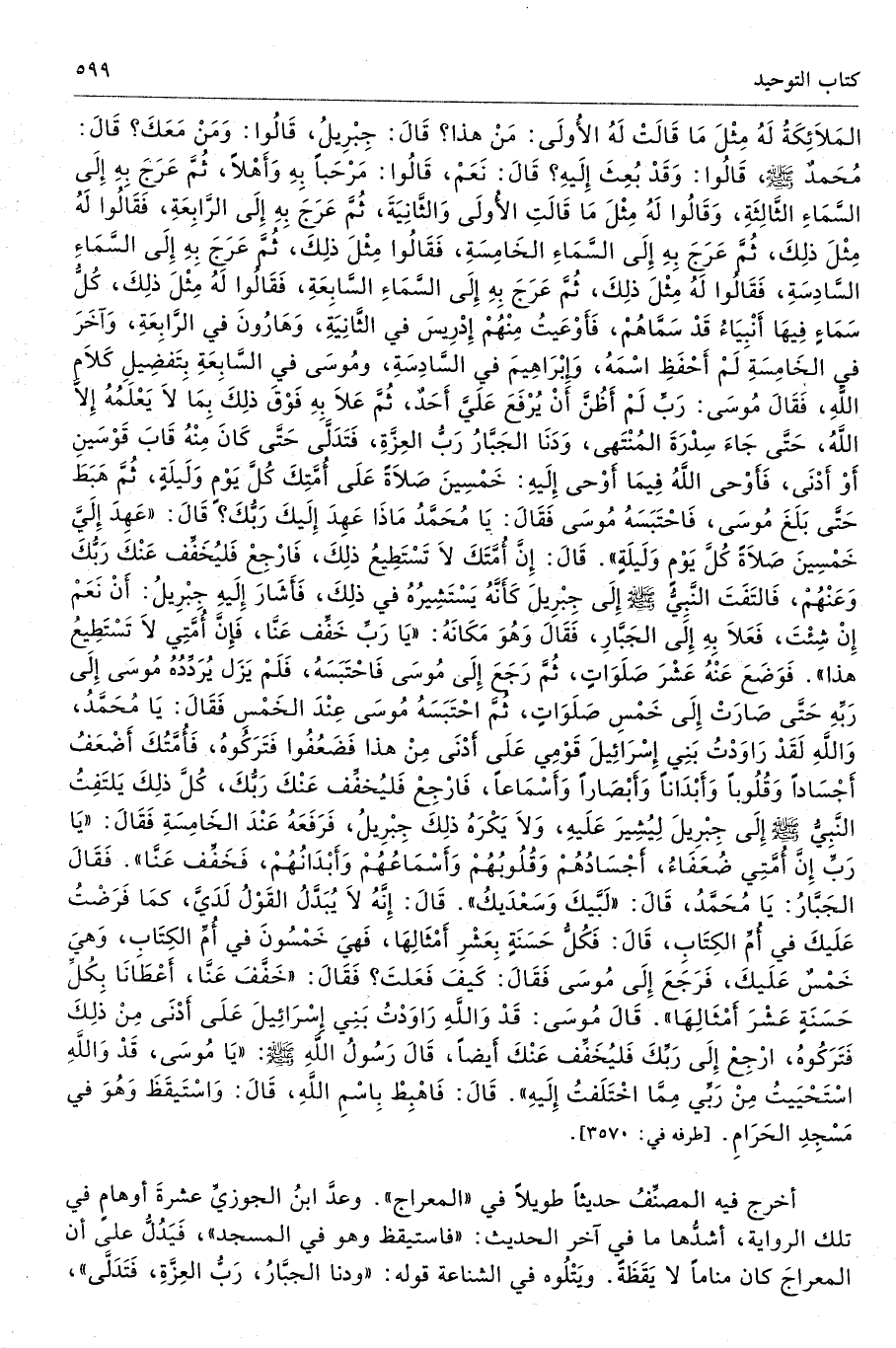أخرج فيه المصنِّفُ حديثًا طويلًا في «المعراج». وعدَّ ابنُ الجوزيِّ عشرةَ أوهامٍ في تلك الرواية، أشدُّها ما في آخر الحديث: «فاستيقظ وهو في المسجد»، فَيَدُلُّ على أن المعراجَ كان منامًا لا يَقَظَةَ. ويَتْلُوه في الشناعة قوله: «ودنا الجبَّارُ، رَبُّ العِزَّةِ، فَتَدَلَّى»،
