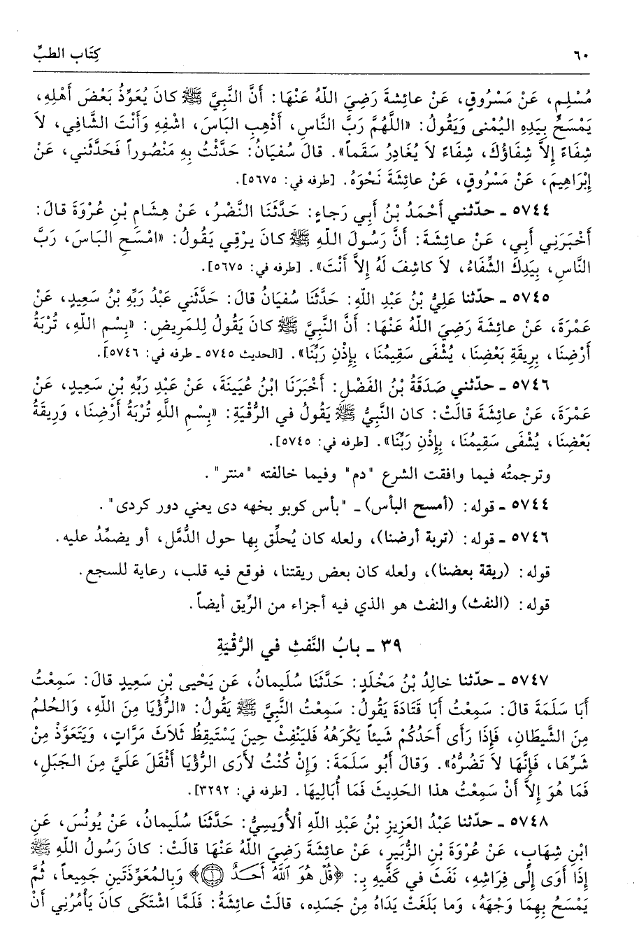 مُسْلِمٍ عَنْ مَسْرُوقٍ عَنْ عَائِشَةَ - رضى الله عنها - أَنَّ النَّبِىَّ - صلى الله عليه وسلم - كَانَ يُعَوِّذُ بَعْضَ أَهْلِهِ، يَمْسَحُ بِيَدِهِ الْيُمْنَى وَيَقُولُ «اللَّهُمَّ رَبَّ النَّاسِ أَذْهِبِ الْبَاسَ، اشْفِهِ وَأَنْتَ الشَّافِى، لاَ شِفَاءَ إِلاَّ شِفَاؤُكَ، شِفَاءً لاَ يُغَادِرُ سَقَمًا». قَالَ سُفْيَانُ حَدَّثْتُ بِهِ مَنْصُورًا فَحَدَّثَنِى عَنْ إِبْرَاهِيمَ عَنْ مَسْرُوقٍ عَنْ عَائِشَةَ نَحْوَهُ. أطرافه 5675، 5744، 5750 - تحفة 17603، 17638 - 172/ 7