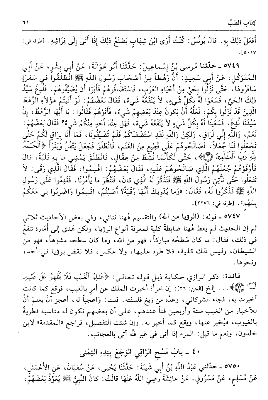 5749 - حَدَّثَنَا مُوسَى بْنُ إِسْمَاعِيلَ حَدَّثَنَا أَبُو عَوَانَةَ عَنْ أَبِى بِشْرٍ عَنْ أَبِى الْمُتَوَكِّلِ عَنْ أَبِى سَعِيدٍ أَنَّ رَهْطًا مِنْ أَصْحَابِ رَسُولِ اللَّهِ - صلى الله عليه وسلم - انْطَلَقُوا فِى سَفْرَةٍ سَافَرُوهَا، حَتَّى نَزَلُوا بِحَىٍّ مِنْ أَحْيَاءِ الْعَرَبِ فَاسْتَضَافُوهُمْ، فَأَبَوْا أَنْ يُضَيِّفُوهُمْ، فَلُدِغَ سَيِّدُ ذَلِكَ الْحَىِّ، فَسَعَوْا لَهُ بِكُلِّ شَىْءٍ لاَ يَنْفَعُهُ شَىْءٌ، فَقَالَ بَعْضُهُمْ لَوْ أَتَيْتُمْ هَؤُلاَءِ الرَّهْطَ الَّذِينَ قَدْ نَزَلُوا بِكُمْ، لَعَلَّهُ أَنْ يَكُونَ عِنْدَ بَعْضِهِمْ شَىْءٌ. فَأَتَوْهُمْ فَقَالُوا يَا أَيُّهَا الرَّهْطُ إِنَّ سَيِّدَنَا لُدِغَ، فَسَعَيْنَا لَهُ بِكُلِّ شَىْءٍ، لاَ يَنْفَعُهُ شَىْءٌ، فَهَلْ عِنْدَ أَحَدٍ مِنْكُمْ شَىْءٌ فَقَالَ بَعْضُهُمْ نَعَمْ، وَاللَّهِ إِنِّى لَرَاقٍ، وَلَكِنْ وَاللَّهِ لَقَدِ اسْتَضَفْنَاكُمْ فَلَمْ تُضَيِّفُونَا، فَمَا أَنَا بِرَاقٍ لَكُمْ حَتَّى تَجْعَلُوا لَنَا جُعْلاً. فَصَالَحُوهُمْ عَلَى قَطِيعٍ مِنَ الْغَنَمِ، فَانْطَلَقَ فَجَعَلَ يَتْفُلُ وَيَقْرَأُ {الْحَمْدُ لِلَّهِ رَبِّ الْعَالَمِينَ (2)} حَتَّى لَكَأَنَّمَا نُشِطَ مِنْ عِقَالٍ، فَانْطَلَقَ يَمْشِى مَا بِهِ قَلَبَةٌ. قَالَ فَأَوْفَوْهُمْ جُعْلَهُمُ الَّذِى صَالَحُوهُمْ عَلَيْهِ، فَقَالَ بَعْضُهُمُ اقْسِمُوا. فَقَالَ الَّذِى رَقَى لاَ تَفْعَلُوا حَتَّى نَأْتِىَ رَسُولَ اللَّهِ - صلى الله عليه وسلم - فَنَذْكُرَ لَهُ الَّذِى كَانَ، فَنَنْظُرَ مَا يَأْمُرُنَا. فَقَدِمُوا عَلَى رَسُولِ اللَّهِ - صلى الله عليه وسلم - فَذَكَرُوا لَهُ فَقَالَ «وَمَا يُدْرِيكَ أَنَّهَا رُقْيَةٌ أَصَبْتُمُ اقْسِمُوا وَاضْرِبُوا لِى مَعَكُمْ بِسَهْمٍ». أطرافه 2276، 5007، 5736 - تحفة 4249