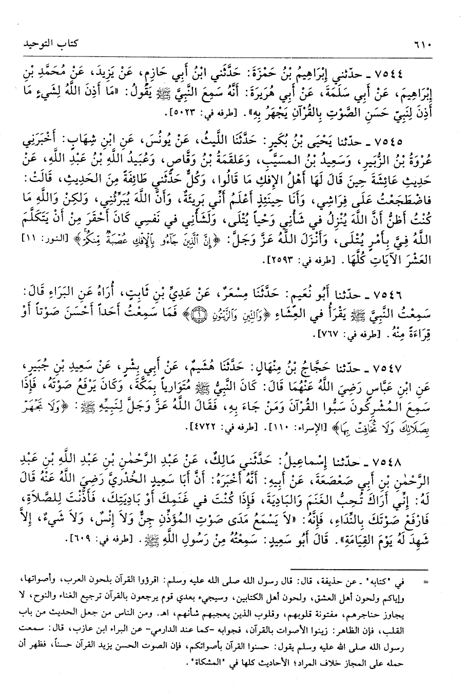 7544 - حَدَّثَنِى إِبْرَاهِيمُ بْنُ حَمْزَةَ حَدَّثَنِى ابْنُ أَبِى حَازِمٍ عَنْ يَزِيدَ عَنْ مُحَمَّدِ بْنِ إِبْرَاهِيمَ عَنْ أَبِى سَلَمَةَ عَنْ أَبِى هُرَيْرَةَ أَنَّهُ سَمِعَ النَّبِىَّ - صلى الله عليه وسلم - يَقُولُ «مَا أَذِنَ اللهُ لِشَىْءٍ مَا أَذِنَ لِنَبِىٍّ حَسَنِ الصَّوْتِ بِالْقُرْآنِ يَجْهَرُ بِهِ». أطرافه 5023، 5024، 7482 - تحفة 14997