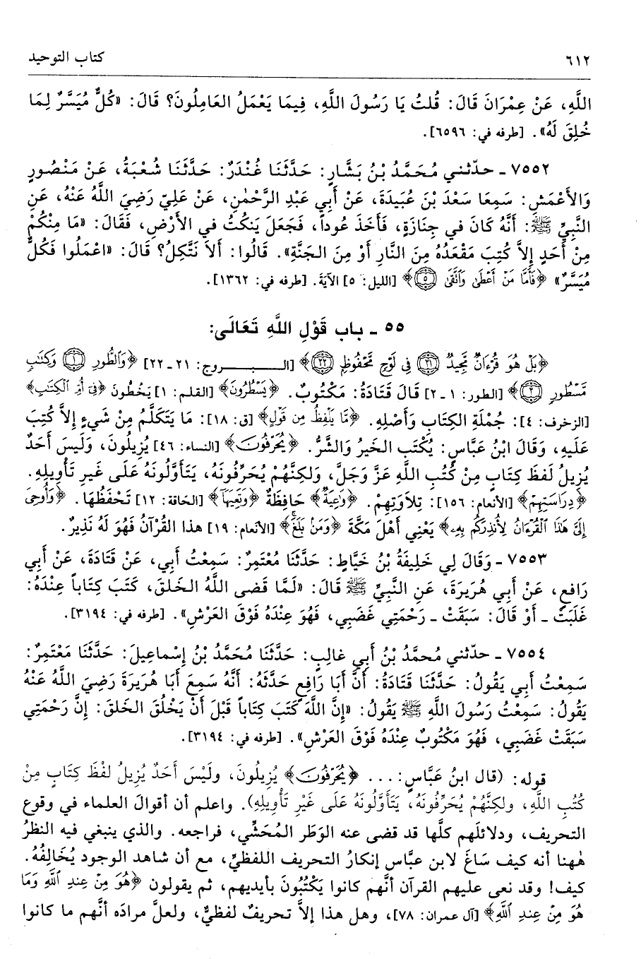 {وَالطُّورِ (1) وَكِتَابٍ مَسْطُورٍ (2)} [الطور: 1 - 2] قَالَ قَتَادَةُ: مَكْتُوبٌ. {يَسْطُرُونَ} [القلم: 1] يَخُطُّونَ {فِي أُمّ الْكِتَابِ} [الزخرف: 4]: جُمْلَةِ الكِتَابِ وَأَصْلِهِ. {مَا يَلْفِظُ مِنْ قَوْلٍ} [ق: 18]: مَا يَتَكَلَّمُ مِنْ شَيءٍ إِلَّا كُتِبَ عَلَيهِ، وَقَالَ ابْنُ عَبَّاسٍ: يُكْتَب الخَيرُ وَالشَّرُّ. {يُحَرّفُونَ} [النساء: 46] يُزِيلُونَ، وَلَيسَ أَحَدٌ يُزِيلُ لَفظَ كِتَابٍ مِنْ كُتُبِ اللَّهِ عَزَّ وَجَلَّ، وَلكِنَّهُمْ يُحَرِّفُونَهُ، يَتَأَوَّلُونَهُ عَلَى غَيرِ تَأْوِيلِهِ. {دِرَاسَتِهِمْ} [الأنعام: 156]: تِلاَوَتُهُمْ. {واعِيَةٌ} حَافِظَةٌ {وَتَعِيَهَا} [الحَاقة: 12] تَحْفَظُهَا. {وَأُوحِيَ إِلَيَّ هَذَا الْقُرْآنُ لِأُنْذِرَكُمْ بِهِ} يَعْنِي أَهْلَ مَكَّةَ {وَمَنْ بَلَغَ} [الأنعام: 19] هذا القُرْآنُ فَهُوَ لَهُ نَذِيرٌ.