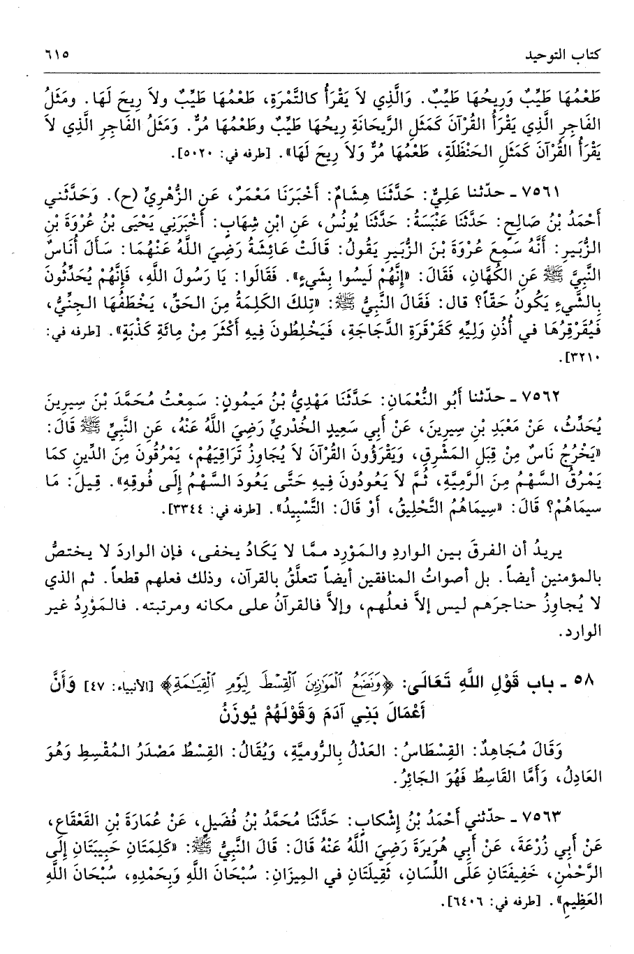 58 - باب قَوْلِ اللَّهِ تَعَالَى: {وَنَضَعُ الْمَوَازِينَ الْقِسْطَ لِيَوْمِ الْقِيَامَةِ} [الأنبياء: 47] وَأَنَّ أَعْمَالَ بَنِي آدَمَ وَقَوْلَهُمْ يُوزَنُ