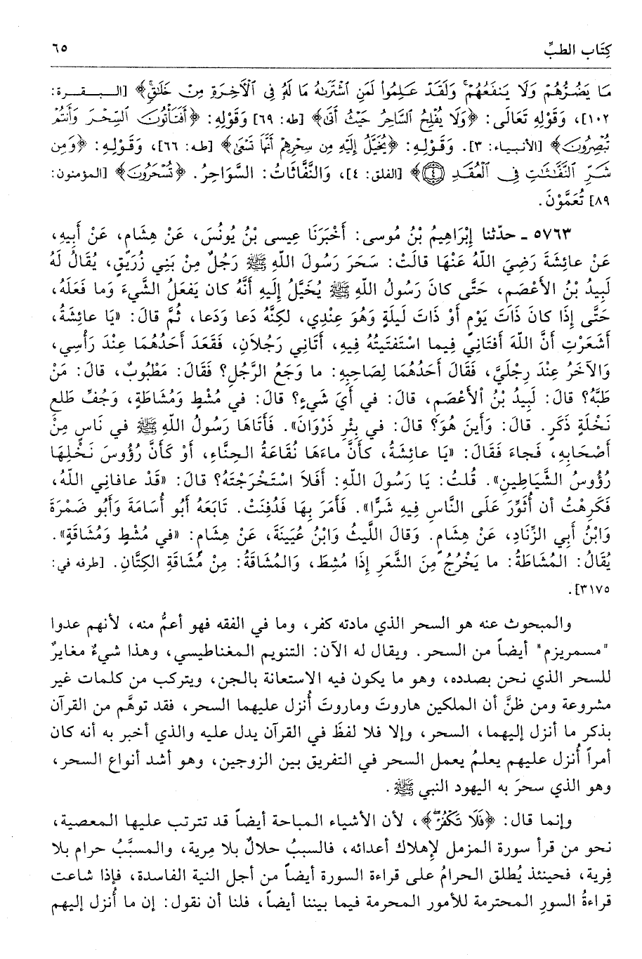 5763 - حَدَّثَنَا إِبْرَاهِيمُ بْنُ مُوسَى أَخْبَرَنَا عِيسَى بْنُ يُونُسَ عَنْ هِشَامٍ عَنْ أَبِيهِ عَنْ عَائِشَةَ - رضى الله عنها - قَالَتْ سَحَرَ رَسُولَ اللَّهِ - صلى الله عليه وسلم - رَجُلٌ مِنْ بَنِى زُرَيْقٍ يُقَالُ لَهُ لَبِيدُ بْنُ الأَعْصَمِ، حَتَّى كَانَ رَسُولُ اللَّهِ - صلى الله عليه وسلم - يُخَيَّلُ إِلَيْهِ أَنَّهُ يَفْعَلُ الشَّىْءَ وَمَا فَعَلَهُ، حَتَّى إِذَا كَانَ ذَاتَ يَوْمٍ أَوْ ذَاتَ لَيْلَةٍ وَهْوَ عِنْدِى لَكِنَّهُ دَعَا وَدَعَا ثُمَّ قَالَ «يَا عَائِشَةُ، أَشَعَرْتِ أَنَّ اللَّهَ أَفْتَانِى فِيمَا اسْتَفْتَيْتُهُ فِيهِ، أَتَانِى رَجُلاَنِ فَقَعَدَ أَحَدُهُمَا عِنْدَ رَأْسِى، وَالآخَرُ عِنْدَ رِجْلَىَّ، فَقَالَ أَحَدُهُمَا لِصَاحِبِهِ مَا وَجَعُ الرَّجُلِ فَقَالَ مَطْبُوبٌ. قَالَ مَنْ طَبَّهُ قَالَ لَبِيدُ بْنُ الأَعْصَمِ. قَالَ فِى أَىِّ شَىْءٍ قَالَ فِى مُشْطٍ وَمُشَاطَةٍ، وَجُفِّ طَلْعِ نَخْلَةٍ ذَكَرٍ. قَالَ وَأَيْنَ هُوَ قَالَ فِى بِئْرِ ذَرْوَانَ». فَأَتَاهَا رَسُولُ اللَّهِ - صلى الله عليه وسلم - فِى نَاسٍ مِنْ أَصْحَابِهِ فَجَاءَ فَقَالَ «يَا عَائِشَةُ كَأَنَّ مَاءَهَا نُقَاعَةُ الْحِنَّاءِ، أَوْ كَأَنَّ رُءُوسَ نَخْلِهَا رُءُوسُ الشَّيَاطِينِ». قُلْتُ يَا رَسُولَ اللَّهِ أَفَلاَ أَسْتَخْرِجُهُ قَالَ «قَدْ عَافَانِى اللَّهُ، فَكَرِهْتُ أَنْ أُثَوِّرَ عَلَى النَّاسِ فِيهِ شَرًّا». فَأَمَرَ بِهَا فَدُفِنَتْ. تَابَعَهُ أَبُو أُسَامَةَ وَأَبُو ضَمْرَةَ وَابْنُ أَبِى الزِّنَادِ عَنْ هِشَامٍ. وَقَالَ اللَّيْثُ وَابْنُ عُيَيْنَةَ عَنْ هِشَامٍ فِى مُشْطٍ وَمُشَاقَةٍ. يُقَالُ الْمُشَاطَةُ مَا يَخْرُجُ مِنَ الشَّعَرِ إِذَا مُشِطَ، وَالْمُشَاقَةُ مِنْ مُشَاقَةِ الْكَتَّانِ. أطرافه 3175، 3268، 5765، 5766، 6063، 6391 تحفة 16765، 16812، 16928، 17022، 17134، 17145 - 177/ 7