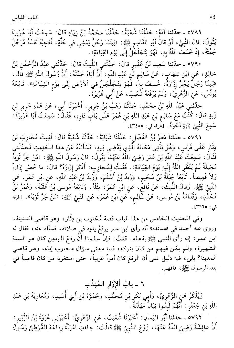 5791 - حَدَّثَنَا مَطَرُ بْنُ الْفَضْلِ حَدَّثَنَا شَبَابَةُ حَدَّثَنَا شُعْبَةُ قَالَ لَقِيتُ مُحَارِبَ بْنَ دِثَارٍ عَلَى فَرَسٍ وَهْوَ يَأْتِى مَكَانَهُ الَّذِى يَقْضِى فِيهِ فَسَأَلْتُهُ عَنْ هَذَا الْحَدِيثِ فَحَدَّثَنِى فَقَالَ سَمِعْتُ عَبْدَ اللَّهِ بْنَ عُمَرَ - رضى الله عنهما - يَقُولُ قَالَ رَسُولُ اللَّهِ - صلى الله عليه وسلم - «مَنْ جَرَّ ثَوْبَهُ مَخِيلَةً، لَمْ يَنْظُرِ اللَّهُ إِلَيْهِ يَوْمَ الْقِيَامَةِ». فَقُلْتُ لِمُحَارِبٍ أَذَكَرَ إِزَارَهُ قَالَ مَا خَصَّ إِزَارًا وَلاَ قَمِيصًا. تَابَعَهُ جَبَلَةُ بْنُ سُحَيْمٍ وَزَيْدُ بْنُ أَسْلَمَ وَزَيْدُ بْنُ عَبْدِ اللَّهِ عَنِ ابْنِ عُمَرَ عَنِ النَّبِىِّ - صلى الله عليه وسلم -. وَقَالَ اللَّيْثُ عَنْ نَافِعٍ عَنِ ابْنِ عُمَرَ مِثْلَهُ. وَتَابَعَهُ مُوسَى بْنُ عُقْبَةَ وَعُمَرُ بْنُ مُحَمَّدٍ وَقُدَامَةُ بْنُ مُوسَى عَنْ سَالِمٍ عَنِ ابْنِ عُمَرَ عَنِ النَّبِىِّ - صلى الله عليه وسلم - «مَنْ جَرَّ ثَوْبَهُ». أطرافه 3665، 5783، 5784، 6062 تحفة 7409، 6669، 6726، 6744، 8282، 7026، 6783، 6793 - 184/ 7