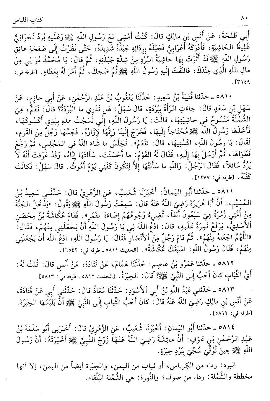 5813 - حَدَّثَنِى عَبْدُ اللَّهِ بْنُ أَبِى الأَسْوَدِ حَدَّثَنَا مُعَاذٌ قَالَ حَدَّثَنِى أَبِى عَنْ قَتَادَةَ عَنْ أَنَسِ بْنِ مَالِكٍ رضى الله عنه - قَالَ كَانَ أَحَبُّ الثِّيَابِ إِلَى النَّبِىِّ - صلى الله عليه وسلم - أَنْ يَلْبَسَهَا الْحِبَرَةَ. طرفه 5812 - تحفة 1353 - 190/ 7